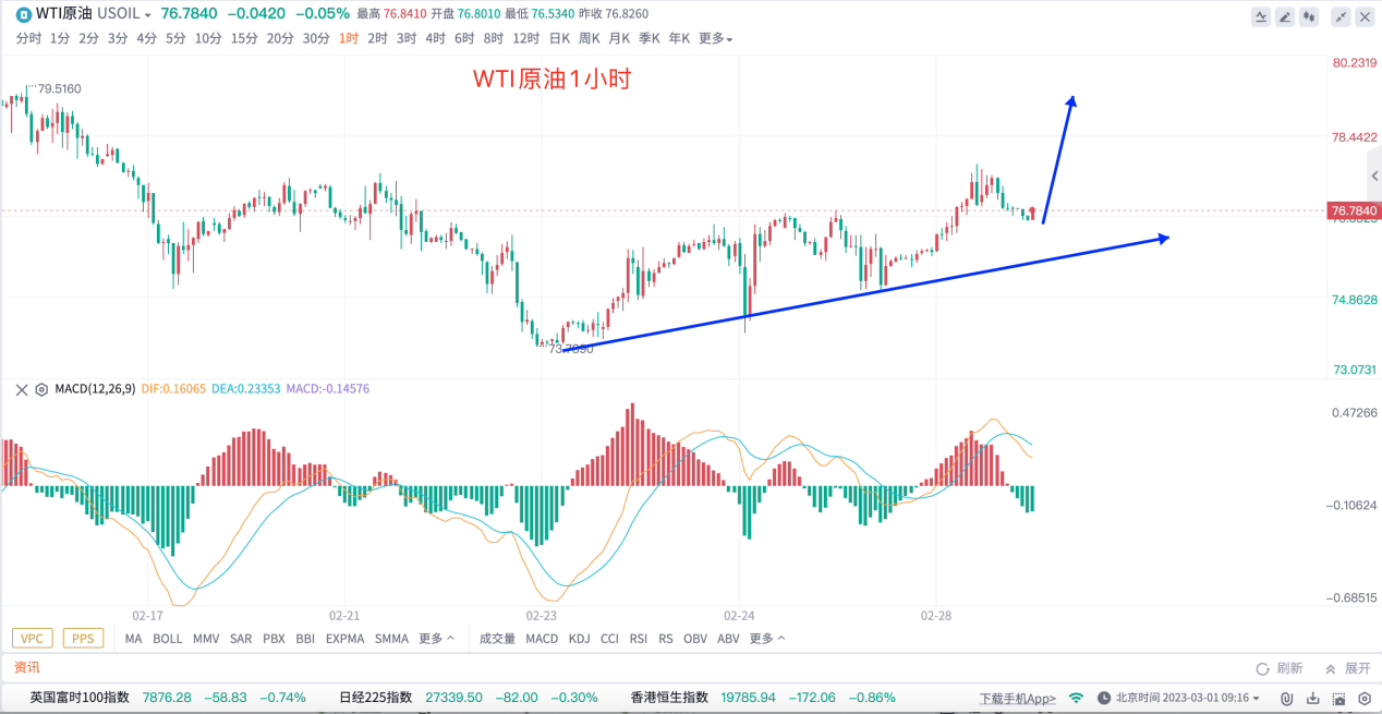 WTI原油经过一轮整理之后,向上突破如其期抵达77.5附近,这也是前期高点的位置,油价的上涨也是这次调整之后反弹的必然,挑战了77.5的高点后,目前行情整理将下方支撑上移至上升趋势线的位置76.2附近,同样也是需要时间上的整理,冲抵短期回调的空间,原油库存数据的变化,才是导致短期油价涨跌的关键所在,不少人,都是短期利益者,爬在电脑前多空博弈,长期持仓者少之又少,那就得注意日线支撑与阻力的切换,及时调整手里的单子,今天继续介入多单。