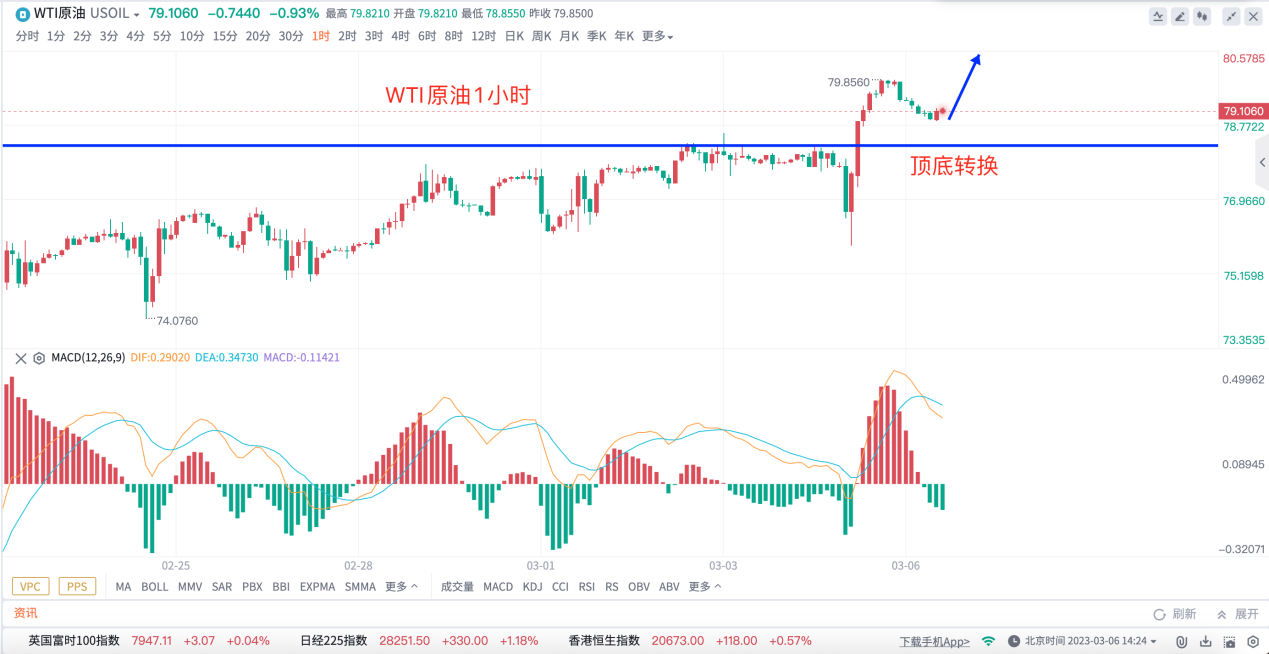 WTI原油大幅上涨,比我预判的78.8还要高,都快要冲到80附近了,油价大幅的上涨向日线箱体震荡上方82附近迈进,虽然在中途上涨的时候来了个深度的调整,但这并不影响油价上涨的方向,节奏和方向保持一致,现在调整的支撑如图中所示,是处于顶底转换的位置78.3-78.5附近,这是前期多头压制的压力点,突破了就形成了回调后考虑再次入场做多的入场位置。