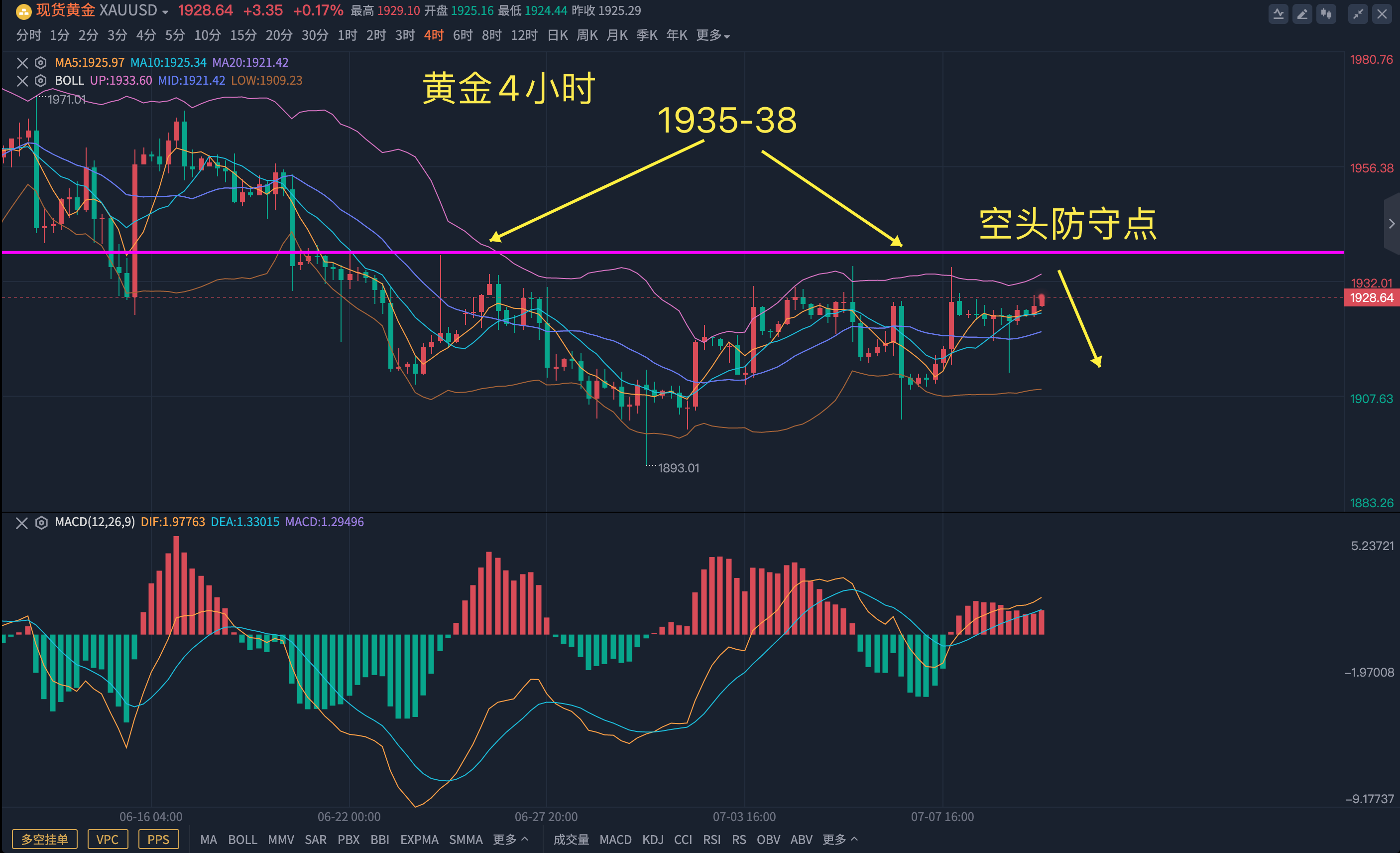如图,金价昨天欧美盘有一波下跌1912美元的位置,而之后快速反弹,主要受22:00美国5月批发销售月率,前值0.2%,市场预期0.3%,而公布值却只有-0.2%,远小于预期和前值,引发金价强势反扑,而1935-38是决定多空的关键所在。今天亚盘经过整理之后,照目前的行形人,会有一波向上的反弹,以1924为支撑点,但空间不会太大,狙击空的占还在1935-38的区域,或者等待亚欧盘走弱之后,美盘反弹再空也行,尤其是1924的位置破位。
