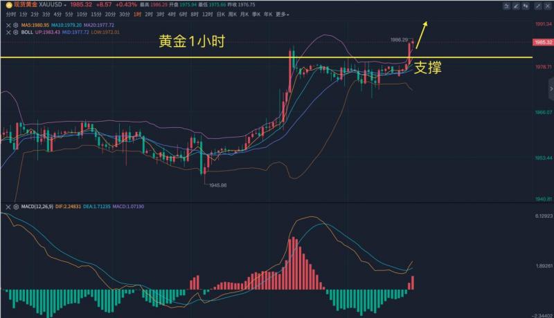 如图,金价强势上涨一点也不意外,1970-1972是前天下午美盘前多头首次冲刺的支撑点,在昨天的回测当中形成了强有力的支撑位置,目前已经刷新新的高点,手里的多已经有15美金左右的利润,而向1990进攻只是时间问题,今天回测的支撑点关注1980的位置,继续延续亚盘上涨,欧盘回撤的口诀,一鼓作气挑战2000美元附近。