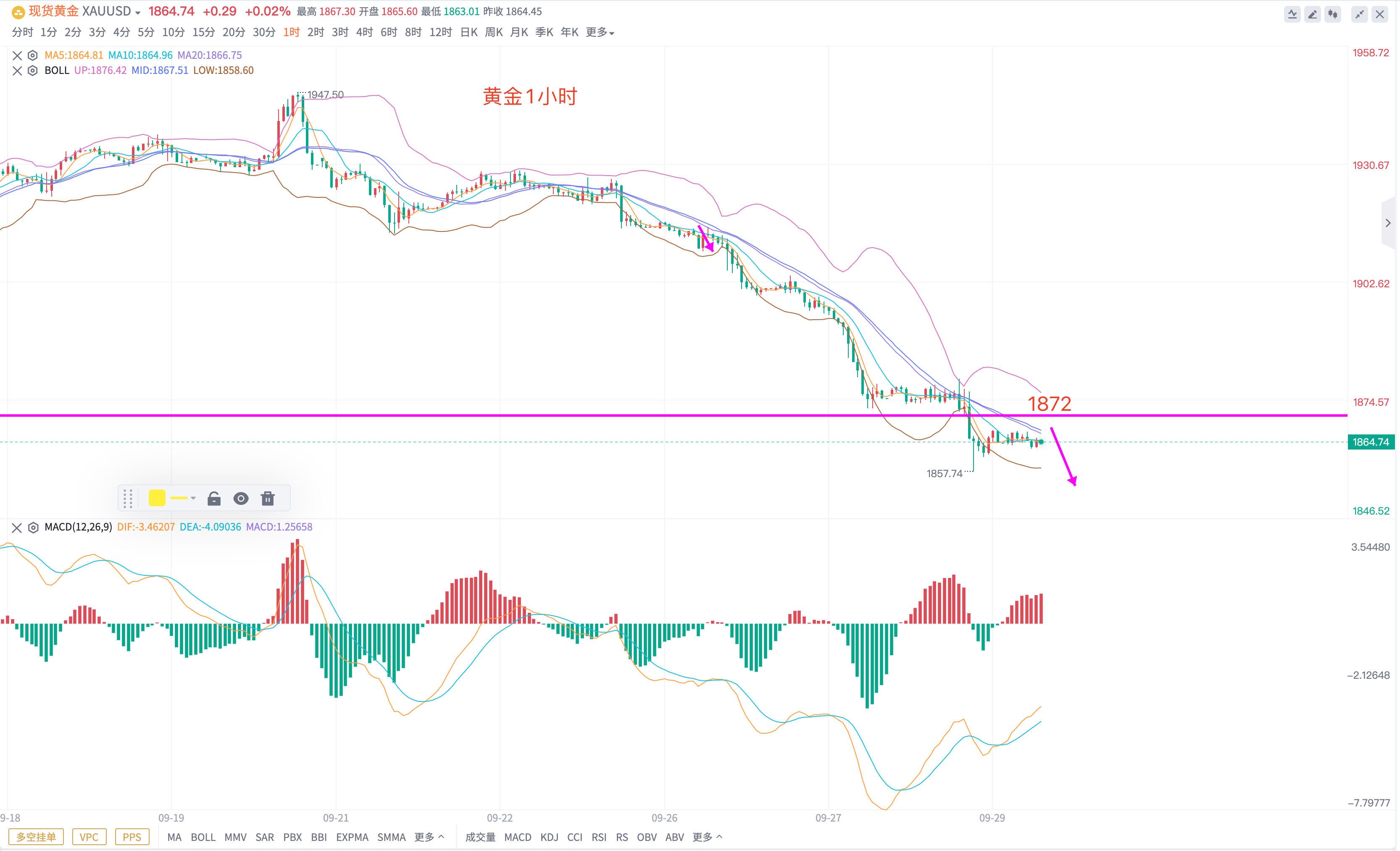 今天,简单说一下,黄金关注的压力在1872,这是顶底转换的位置,昨天的行情一直是支撑在1872-73的位置下不去,美盘后半夜空头发力拿下了这个支撑点,那现在就是顶底转换继续空,同样的1865,1868空区别也不大,这种弱势下跌最容易错过的原因,就是老是等反弹,总想着高一点,再高一点,结果就是拍大腿了,弱势不反弹,反弹不弱势,以1872-73作为多空分界点,空黄金即可。