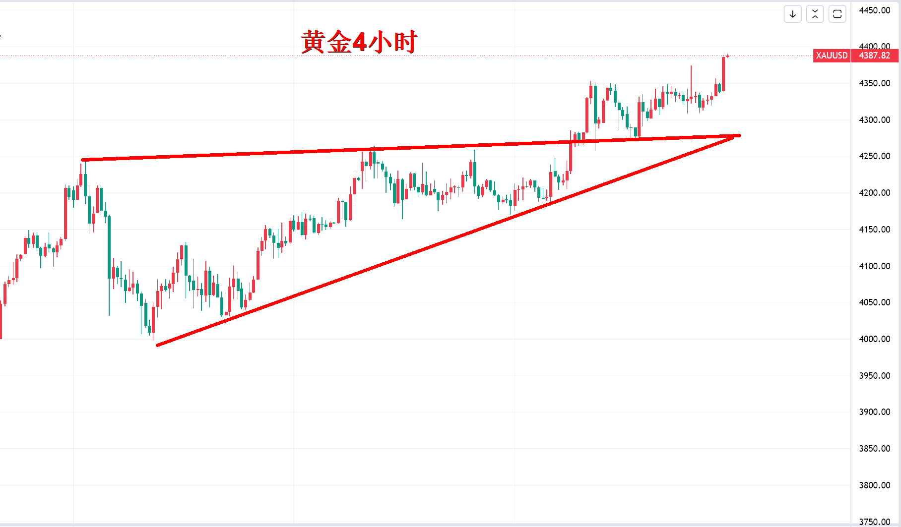 目前,4小时整体行情已经突破4380前高点,亚盘加速向上挑战新高,前期整理后区间不断压缩,现在要关注欧盘的延续性,也就是说突破后亚盘上涨,欧盘只要守在亚盘起涨点上方,美盘前依旧有多的机会。
