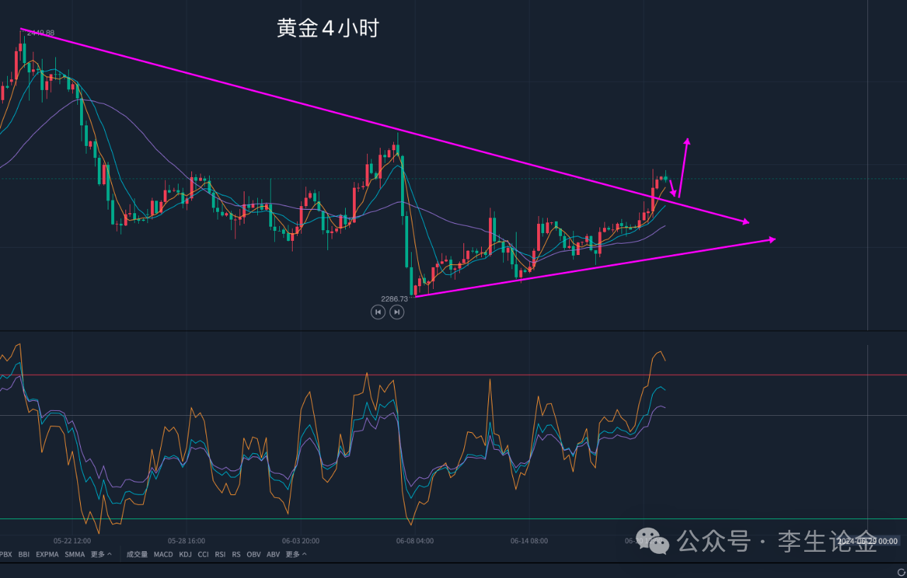 整个6月,跟冬天西安的雾霾一样,多空来回拉扯,上下震荡,最终月线收十字K。 上半年,黄金整体表现成绩斐然,涨幅超过15%以上,人民币黄金从480涨到了580,每克涨幅超100元。 接下来,正式进入2024年下半年,黄金会不会延续上涨,继续向上冲击历史新高,以我的感受而言,市场很乐观,黄金突破2500,
