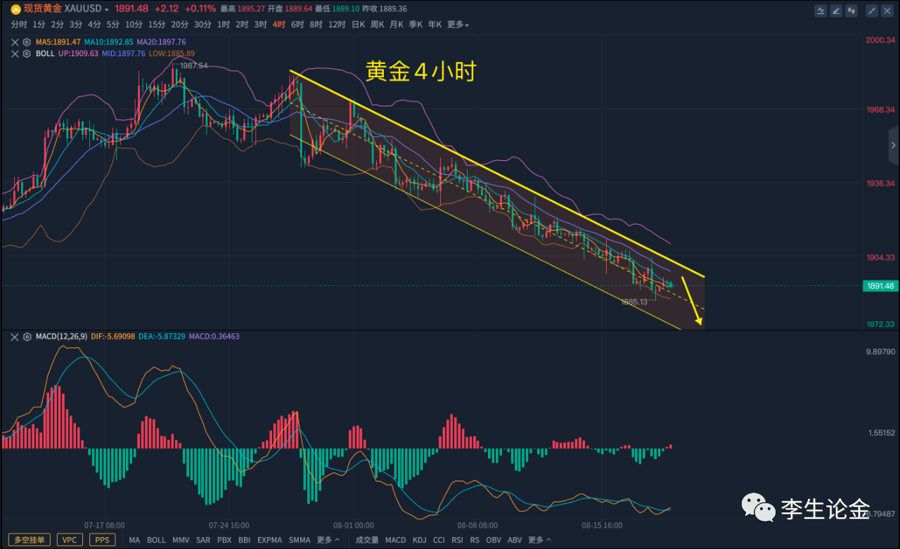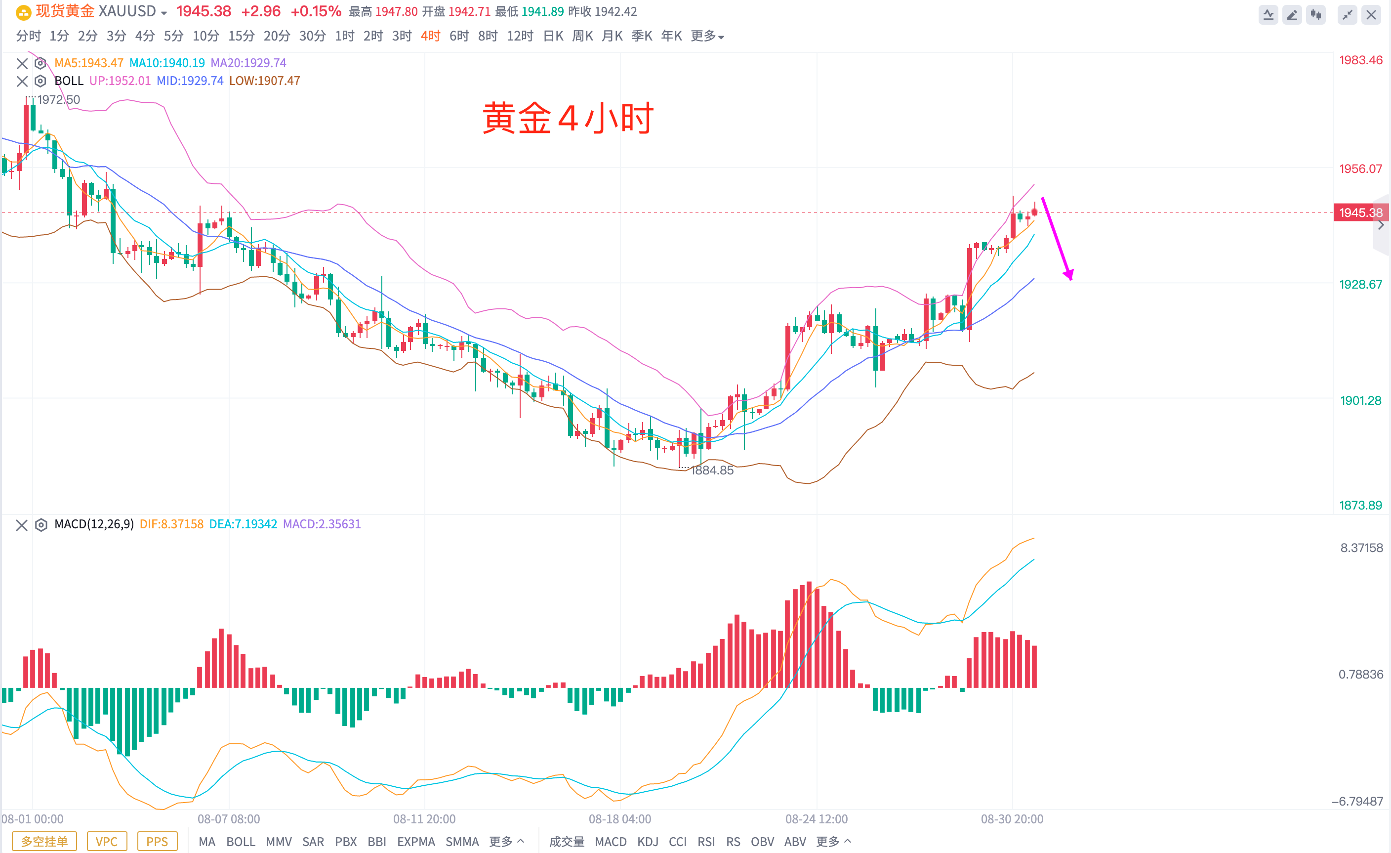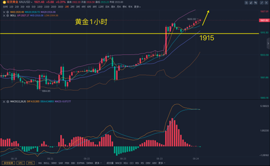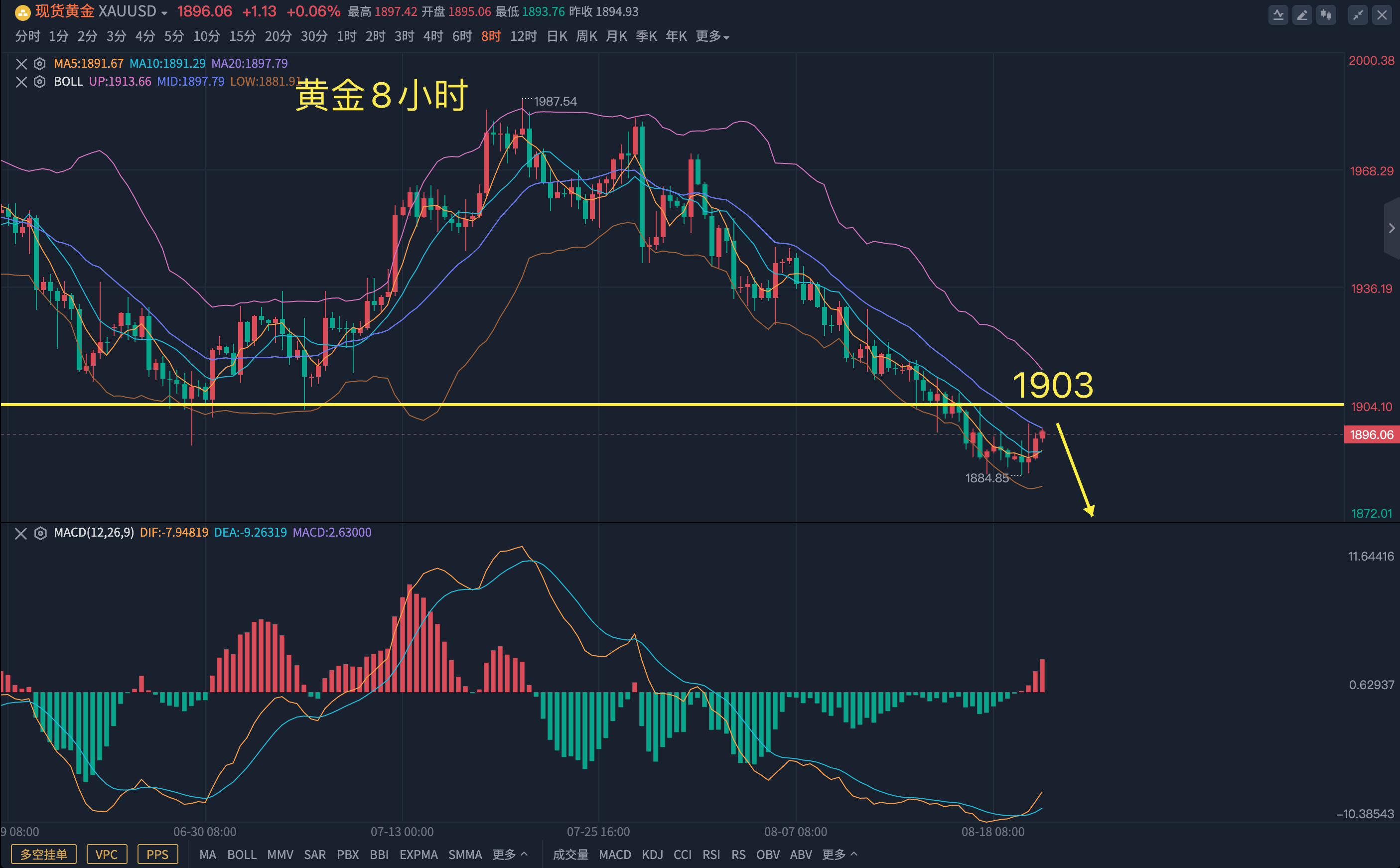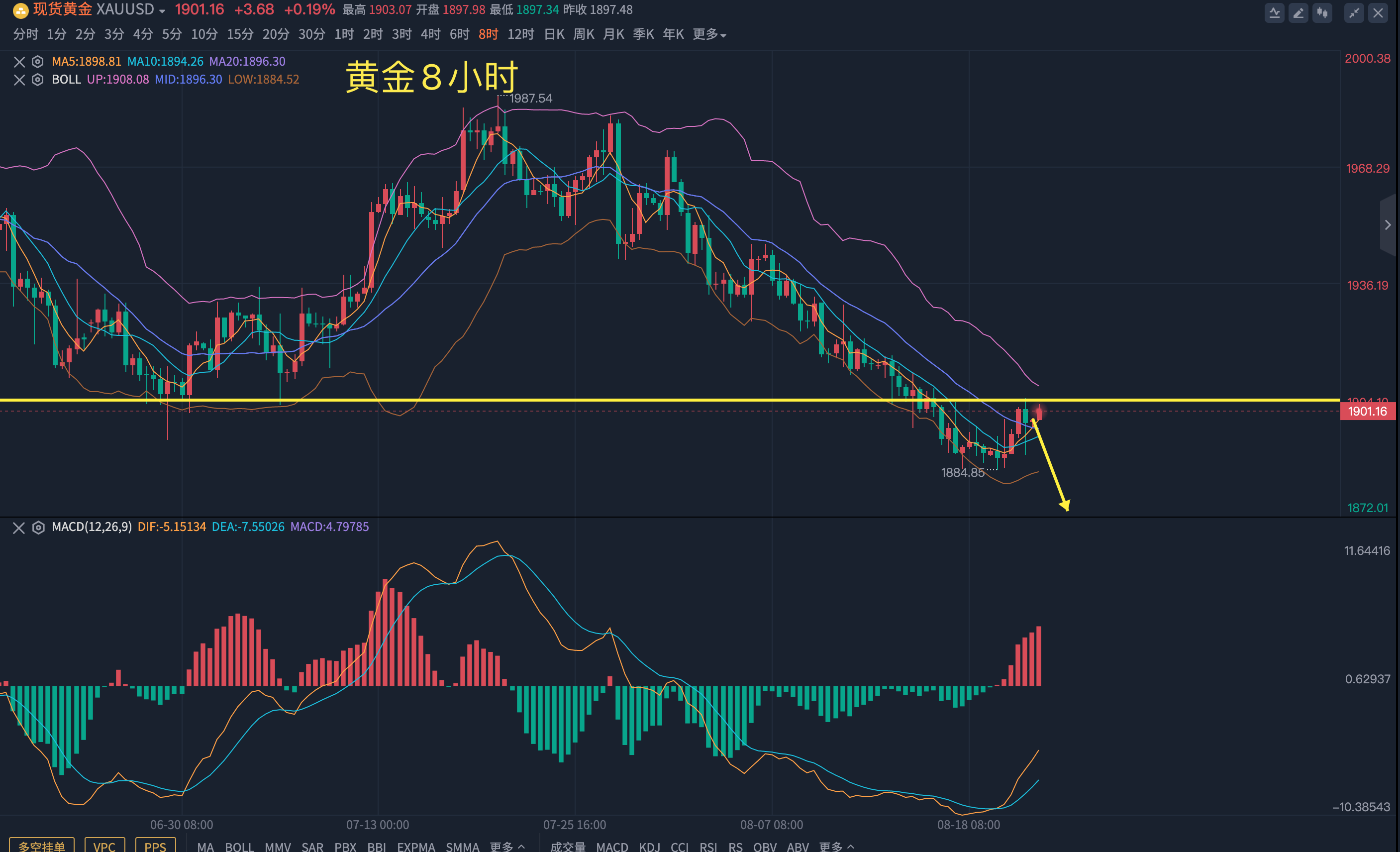 烂泥扶不上墙,会不会累死扶墙的?8月25日,北京时间22:05,美联储主席鲍威尔将在杰克逊霍尔全球央行的年会上讲话了,连跌四周的黄金,难道在等鲍威尔这位“救世主”?。 七夕节,市场还是很暖心,没有大的波动,让大家有个好心情与爱人共度良宵,金价一直卡在1900附近徘徊,给多空足够遐想的时间,这已经是震荡的
