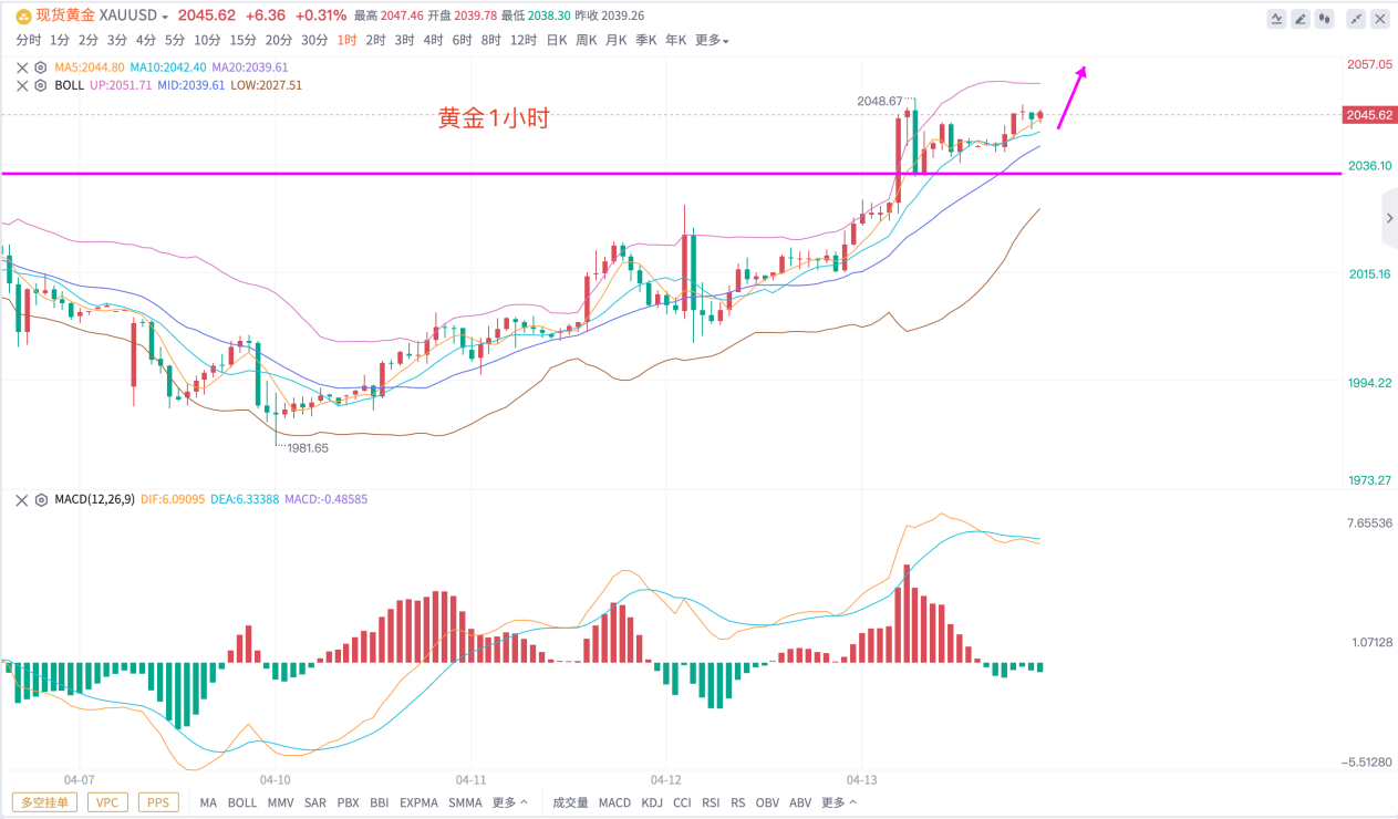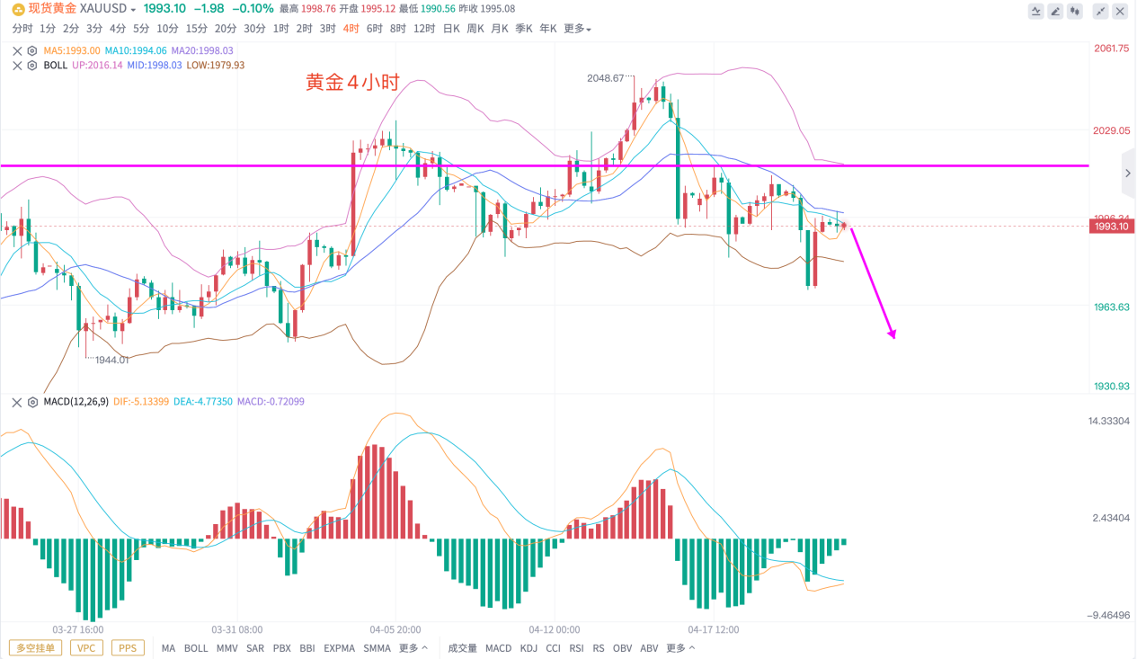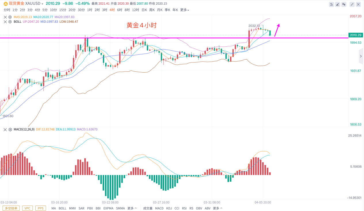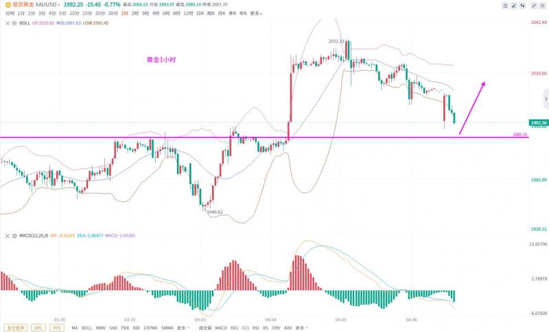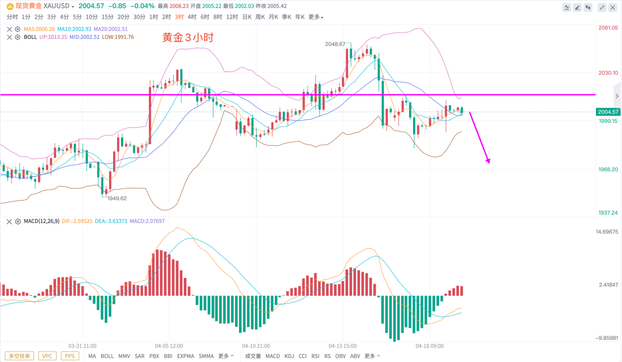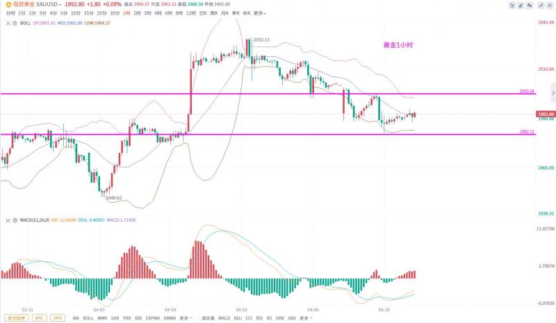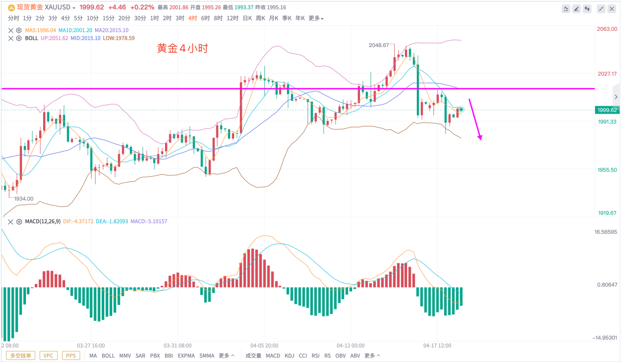 上周五,由于非农数据刚好遇上复活节,黄金市场行情哑火!但交易的热情并没有锐减,今天早间开盘之后,黄金价格大幅低开16美金,近期价格出破2000美元/盎司之后再一次回落。黄金市场热情就在于突破前期2070美元高点位置,一旦这个位置被突破,我非常肯定,这样有大批黄金衍生品的从业者以及交易者跑步入场,交易市场的情