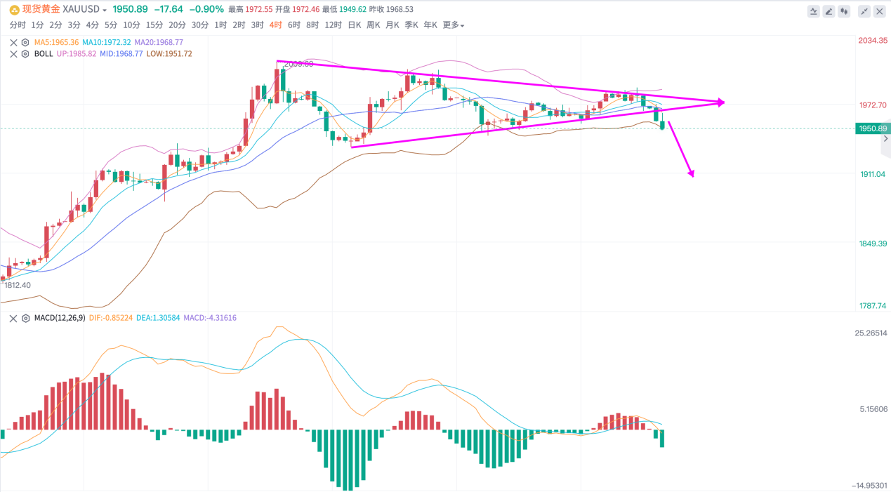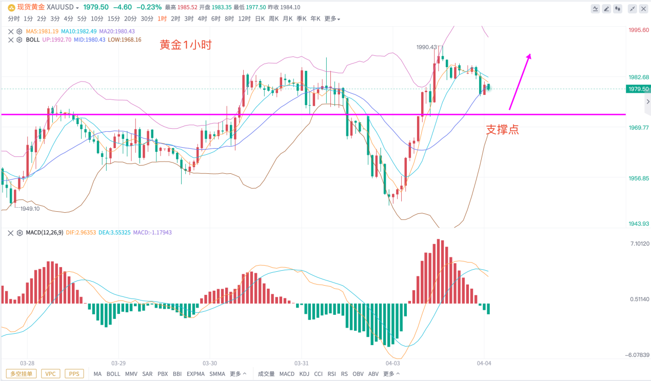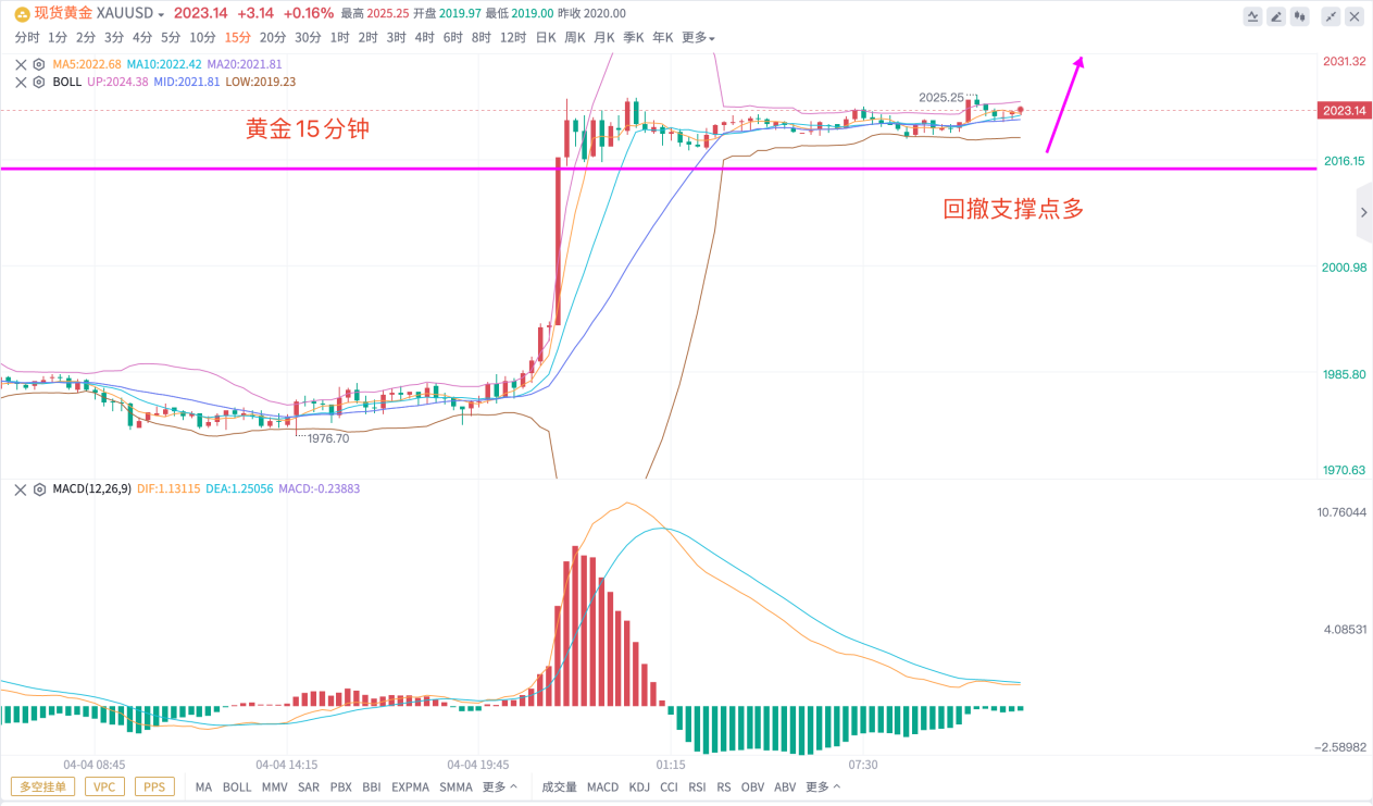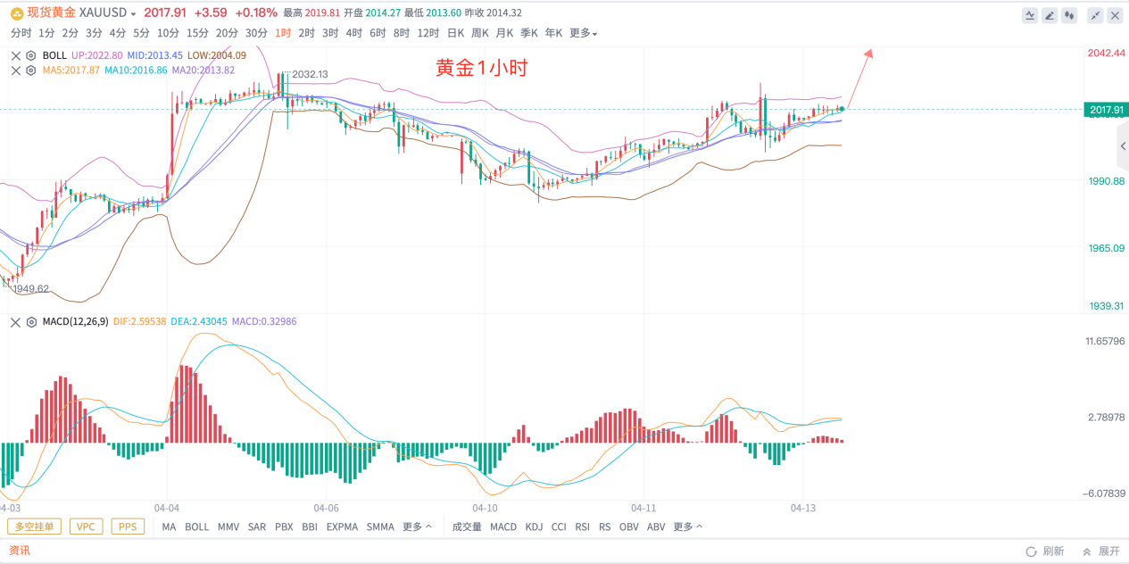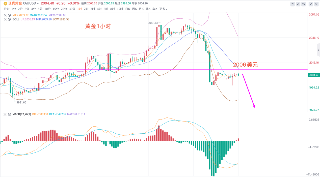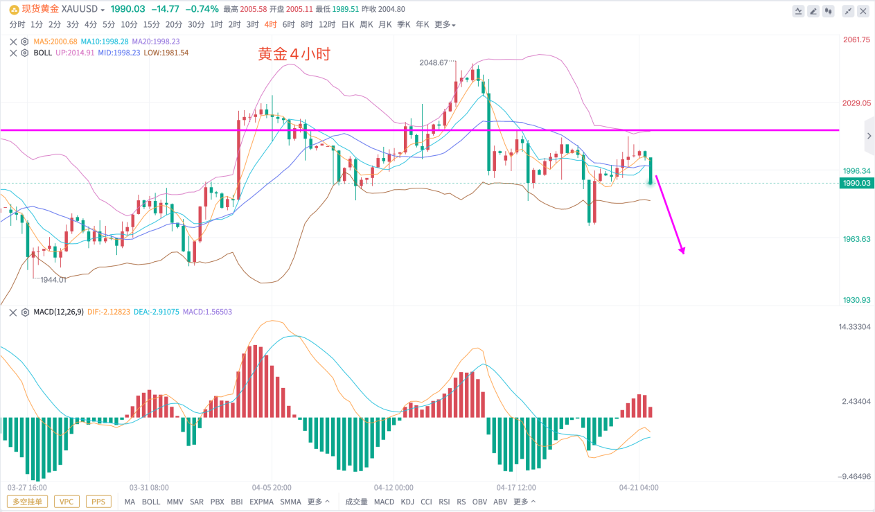 上周五,由于非农数据刚好遇上复活节,黄金市场行情哑火!但交易的热情并没有锐减,今天早间开盘之后,黄金价格大幅低开16美金,近期价格出破2000美元/盎司之后再一次回落。黄金市场热情就在于突破前期2070美元高点位置,一旦这个位置被突破,我非常肯定,这样有大批黄金衍生品的从业者以及交易者跑步入场,交易市场的情