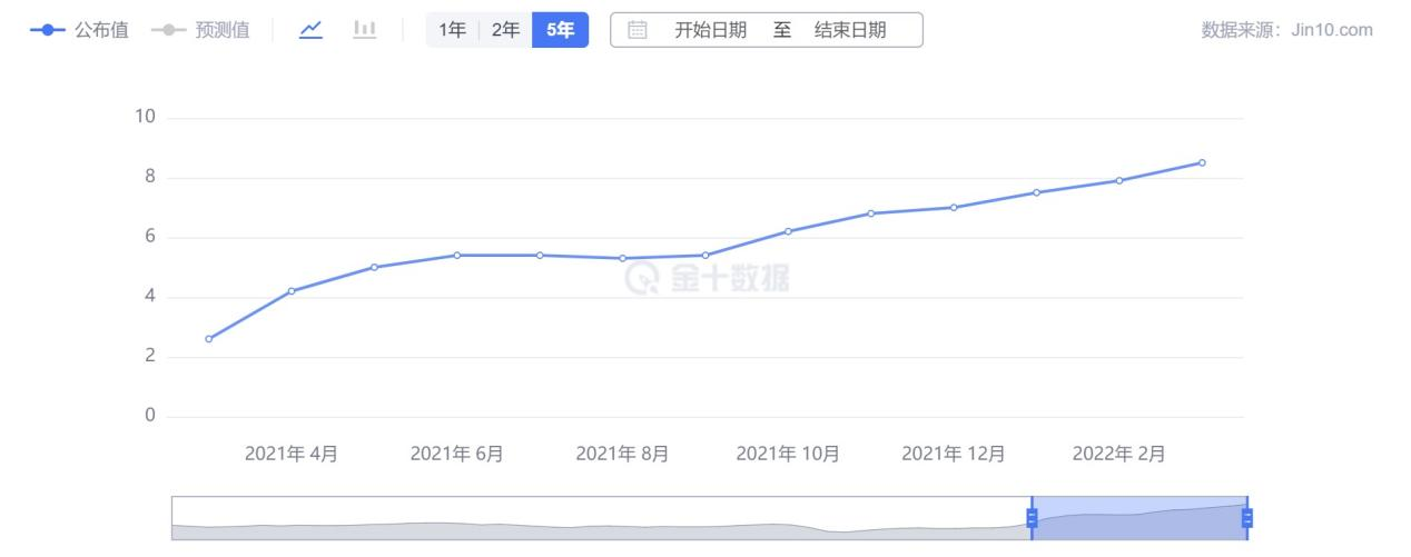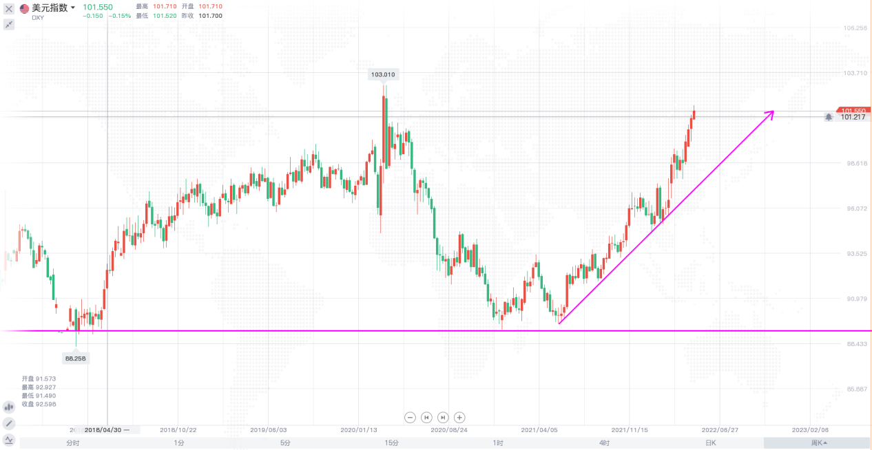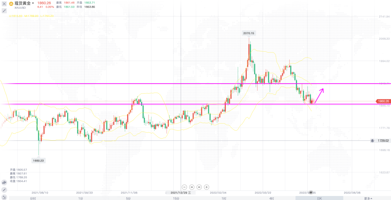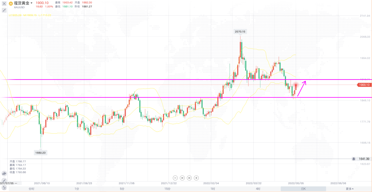 昨日,美元指数再度刷新高点,创2017年1月以来新高至103.28,日线收得五连阳,市场预期美联储将比其他主要央行更加鹰派,美元还受益于全球经济成长忧虑,欧洲正艰难应对俄乌冲突的影响。随着美元飙升,黄金价格刷新近二个月低点至1881美元附近,美元持续走强,市场押注美联储将成功压低通胀,这让黄金感到不安,下行的风