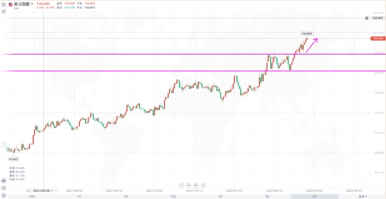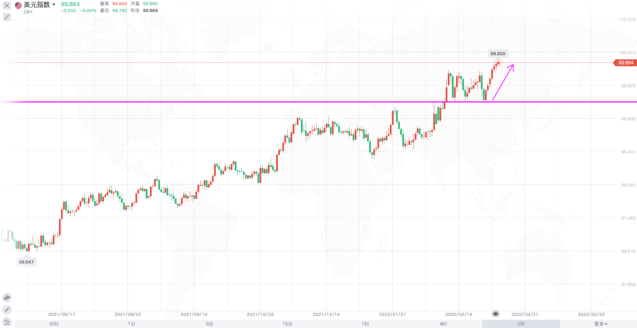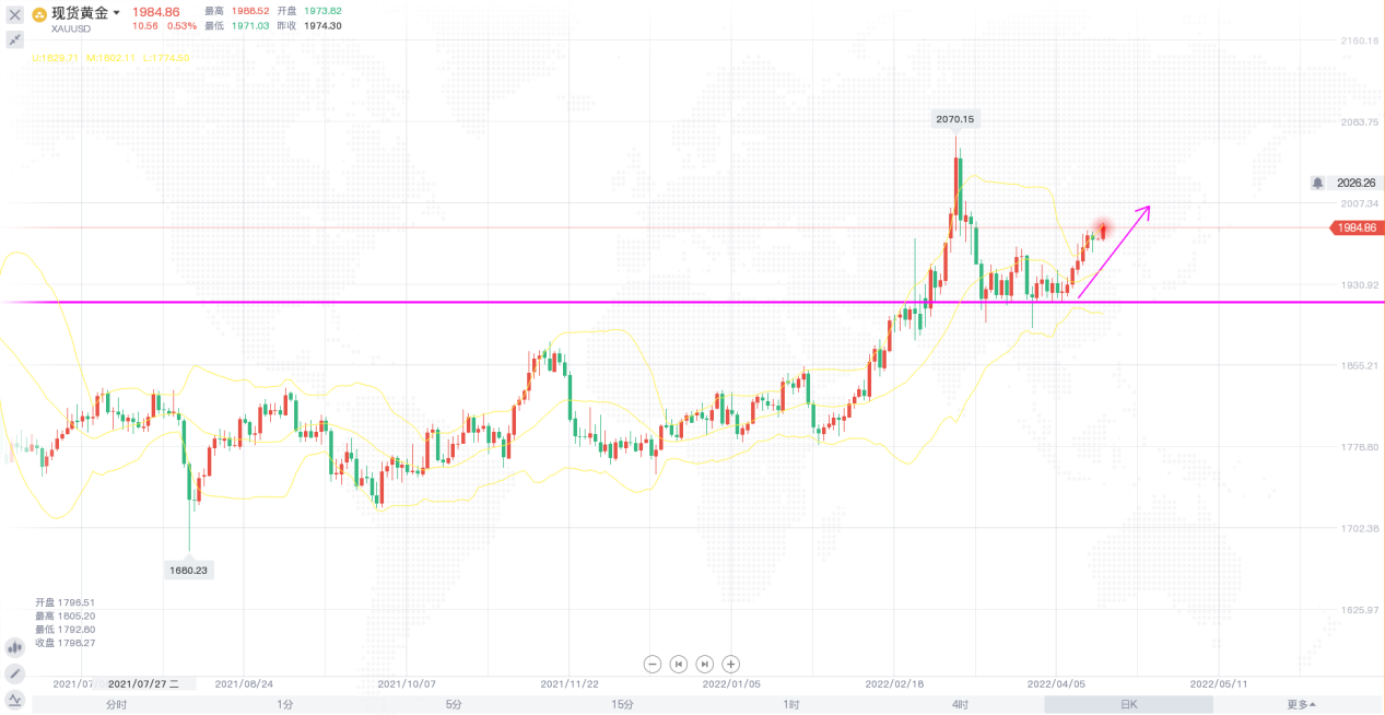 昨日,美元指数在震荡的市场中创下两年新高,十年期美债收益率进一步上涨,触及2.884%的逾三年高位,随着美债收益率上升,市场准备迎接美联储进行多次50个基点的加息。受俄乌战事持续升级影响,避险情绪升温,金价周一一度升至1998美元附近,但美联储强化多次加息50个基点的预期,美元非常强势,再次刷新近两年高点,令