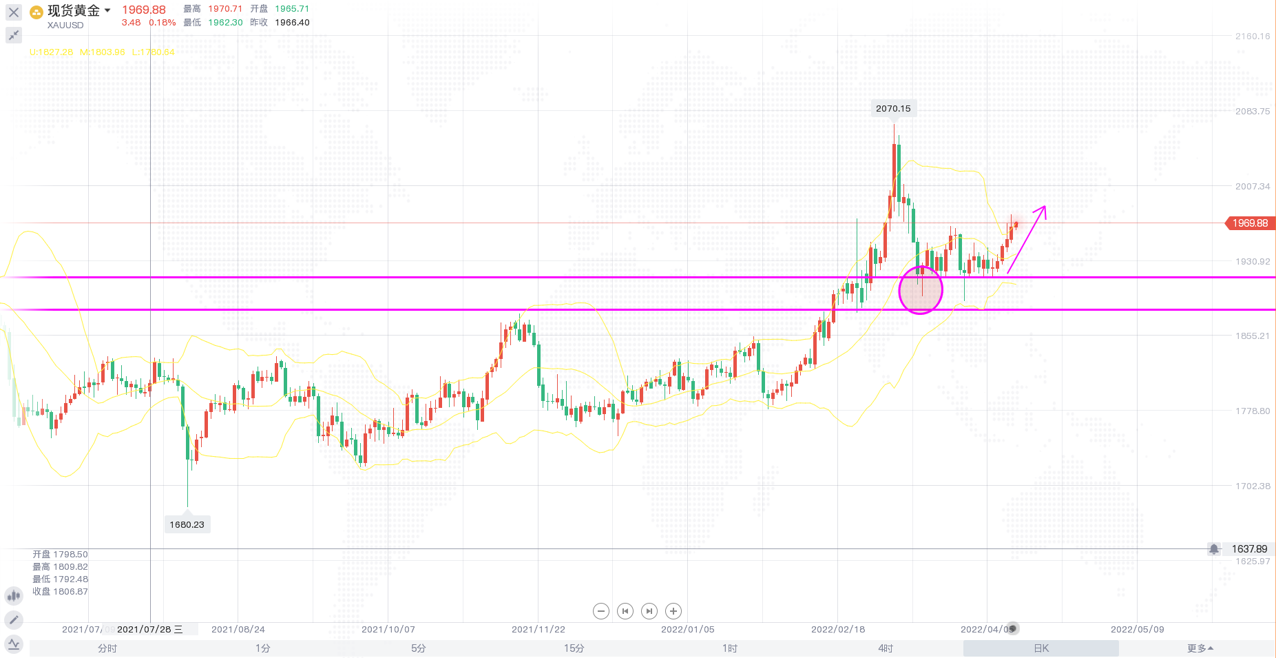 昨日,美元指数从近两年高点回落,因欧元在周四欧洲央行政策会议前逆转走势,由跌转升,美英两国公布的通胀指数涨幅大于预期,推动金价连续上涨。同时,美方周三宣布向乌方提供8亿美元的额外军事援助,加剧了战事恶化的预期,而且不断上涨的消费者物价增强了黄金作为通胀对冲工具的吸引力,市场似乎选择忽视美联储即将加