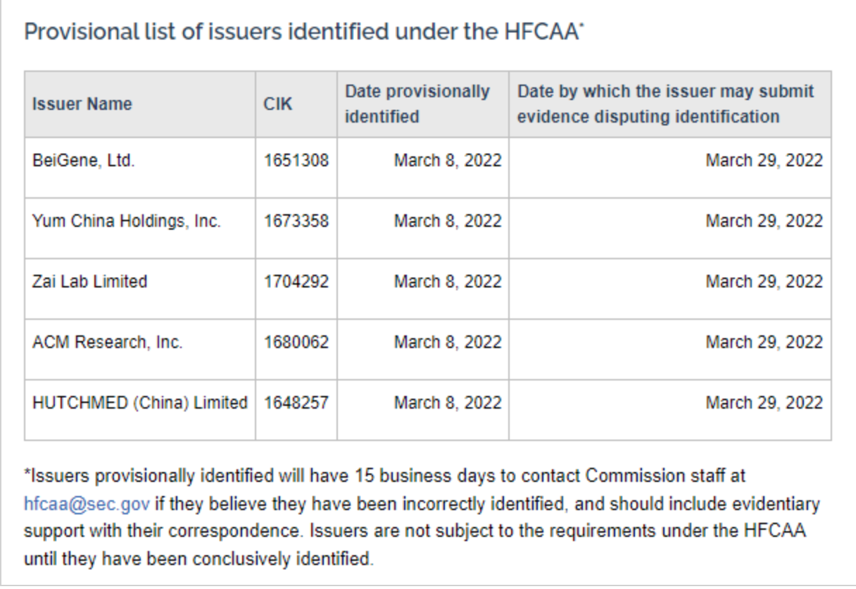 周四,中概股被抛弃了,5家公司可能遭强制退市的消息引发腥风血雨,不少投资者被空头“活埋”。 美国证券交易委员会(C)官网公布了一份包含五家中概股公司的名单,名单中的公司可能面临被摘牌的风险。名单包括:百济神州、百胜中国、再鼎医药、盛美半导体、和黄医药。 C称,基于《外国公司问责法案》(HFCAA