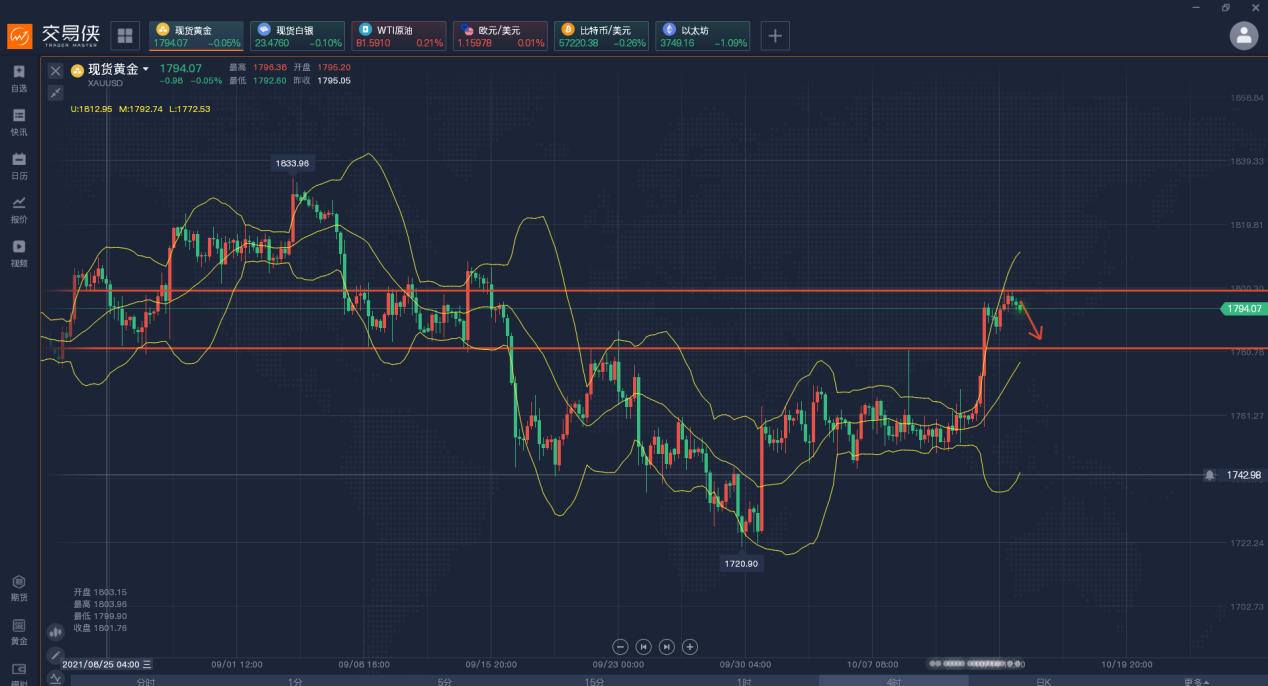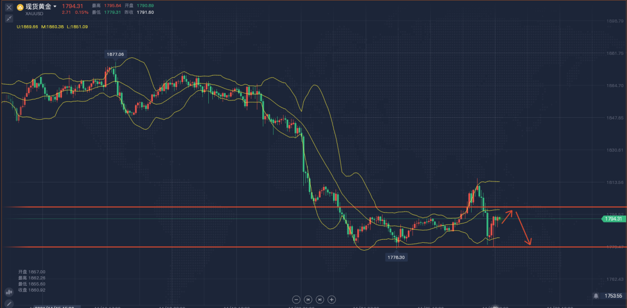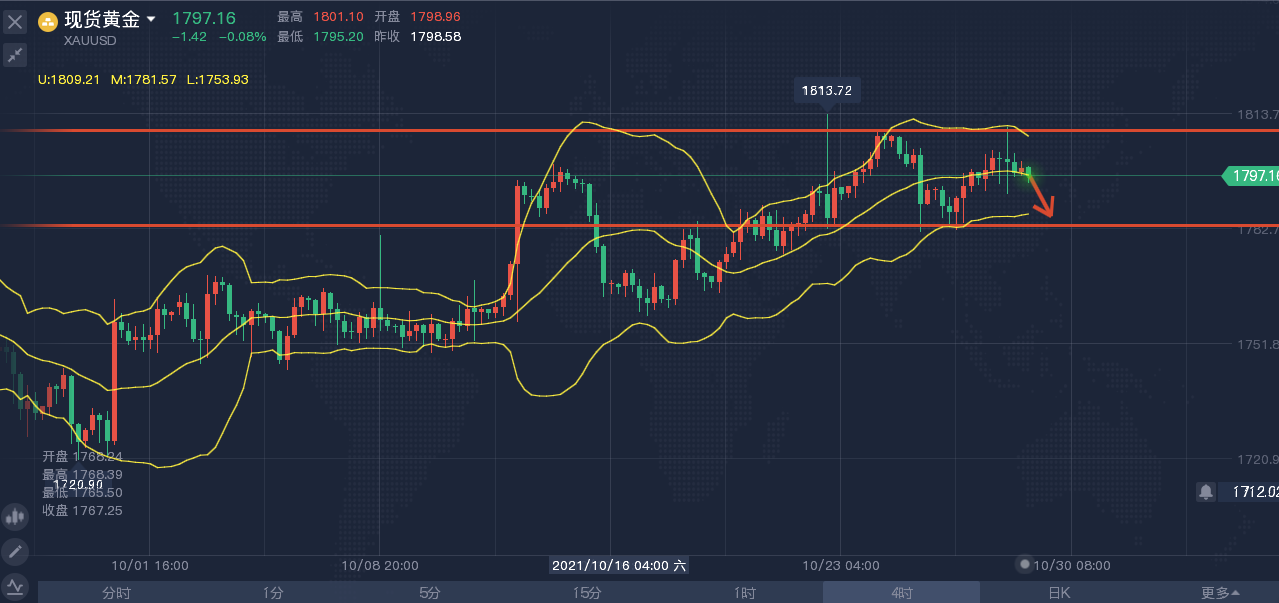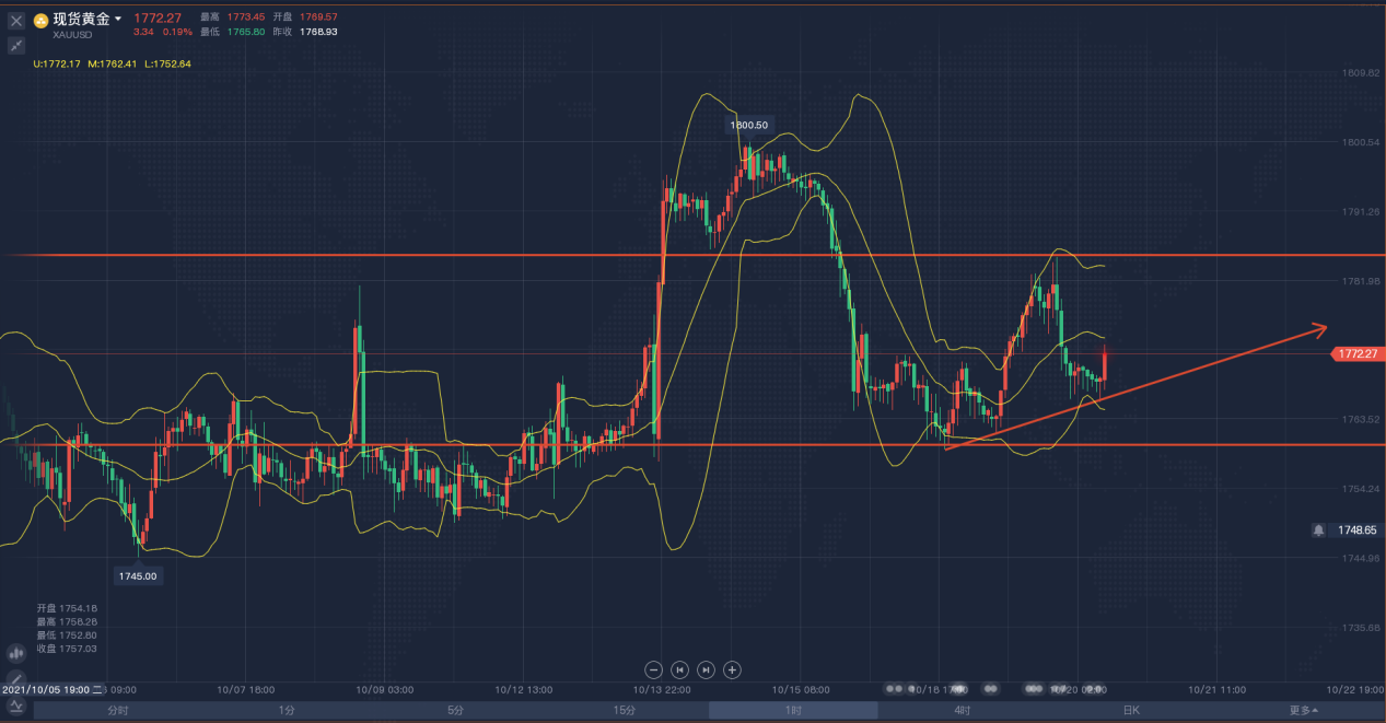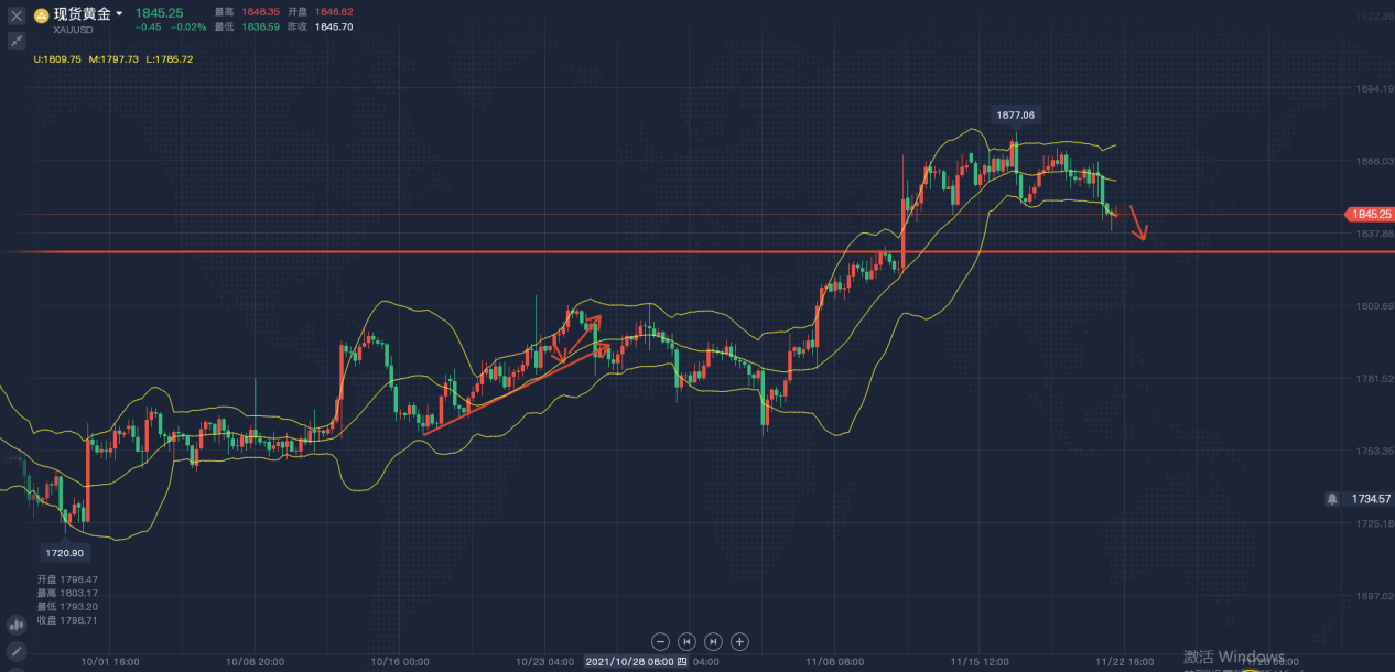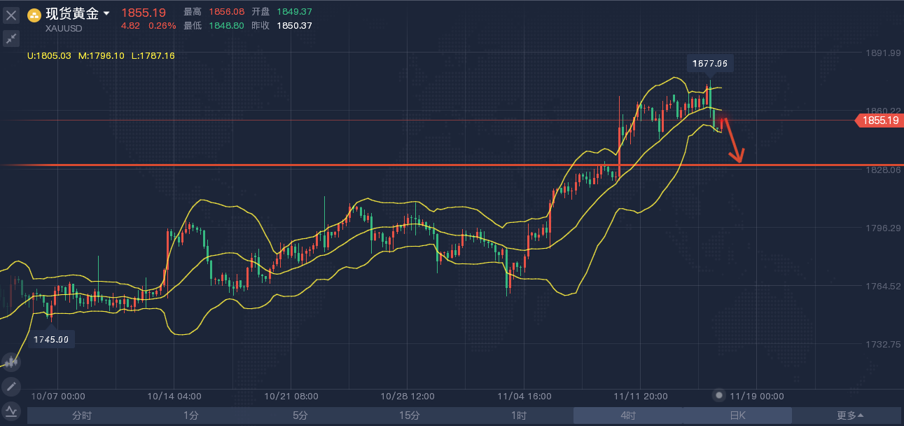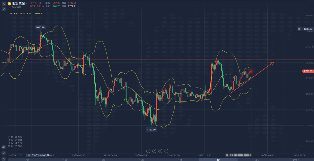 昨日,金价迎来四连涨,主要因为美元及美股的疲软走势支撑金价,另外I指数也令通胀预期居高不下,导致有抗通胀属性的黄金获得青睐,但布拉德的鹰派讲话限制金价涨势,他预计美联储在明年中结束缩减购债行动后,将在2022年加息两次。目前,美联储成员在加息的问题上存在分歧,然而,通胀与就业两大主题始终是他们关注的重