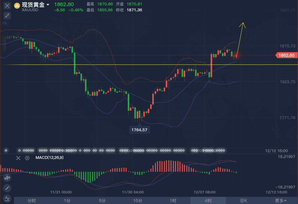 生活中,懂得进退,方能成就人生,你我不是智者,不可能悟透所有的哲理,更不是禅者,不可能释然尘世一切,唯一能做的,就是踏实的生活,捡起曾经的初衷与热情,踩着行情的快乐与烦恼,预览属于自己的美好未来。 周一,金价近日持续反弹,盘中一度跌至1822附近之后,形成了与12月4日凌晨支撑位置1824双底走势,强势延