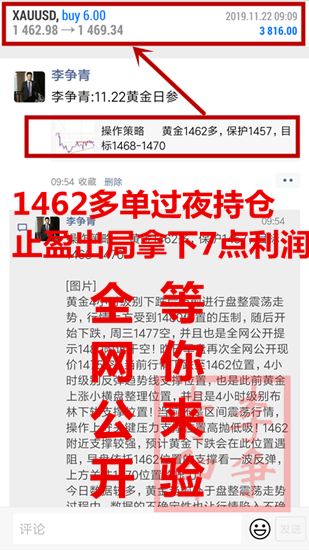交易之道,循序渐进,步步为营,当错过了一波趋势的开始,就没有必要纠结于是否去参与趋势的结束,怀疑和懦弱都是成功的拦路石,成功来源于尝试,昨天行情整体波动不大,争青在1452布局短线多单,在1456止盈出局,拿下2000美金利润。 这次名额空出来,不论你之前亏损多严重,现在多少资金跟上实盘,争青都能帮你挽回亏损!
