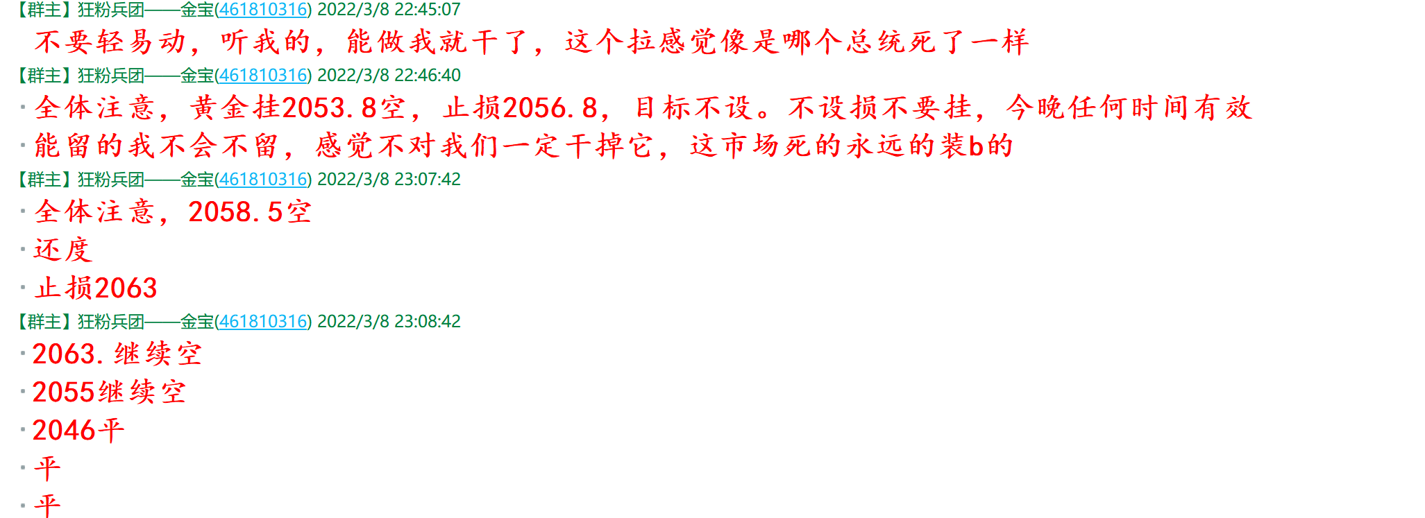 昨天金价全一天波幅在200块以上,市场波幅放大,随便一波都是20-30块,而昨晚在上破20后哪种拉法有点变态,就是08年的雷曼兄弟倒闭发生金融危机也没这么疯狂,个人理解明显是华尔街在收割韭菜,不管俄乌局势还是当下的通胀问题,并没有使黄金疯狂的如此地步,所以作为我们散户投资者一定要平心气的对待,市场波动是大,但风险相对来说比平时至少放大了十倍,这好比美女是多,也只能看,否则会出问题的,对于当下的行情也一样,多与空没有对错,只做属于自己看懂的哪一段就足够了,全吃下去容易撑死,何况我们也没有哪个能力,有的朋友说哪你一直多,未必你能拿的住,也不要被说中线的多的所诱导,中线是损了无数次最后出来的一个中线,损了五次五十块,一次中线赚了四十块,其次不要追杀涨跌,这种行情什么人在追一是新手,二是所谓的伪专家自己实盘不做,但敢喊反正不是亏自己人,涨了就追多跌了就追空,这种经历过的都知道是怎么回事,所以还是哪句话,行情波动放大了,我相信只要有点能力的随便搞几波还是可以的,一波搞个十几二十块足够了,几波下来收益一样可观,像昨晚那种涨90跌50回30,回落多是不是坑,反弹空一样的坑,所以不要看山就是山,平静对待,机会是等来的,这就好比昨晚我们1916空减仓留下的打掉以后,直接挂53.8空虽然损了,但是至于规避了大家提前进空的想法,虽然后边58的也损了,但是2063和55加空到46一样是利润,所以总结就是赚能力之内的就够了,多大屁股被多大的裤C,高位进了多回落20块再涨与我们一样没关系。