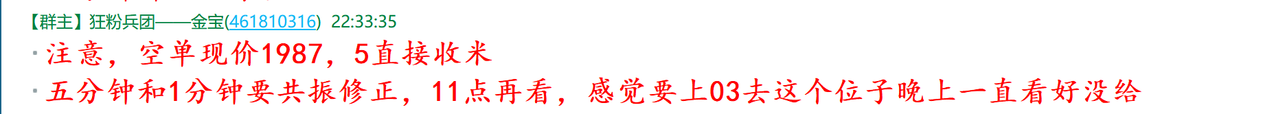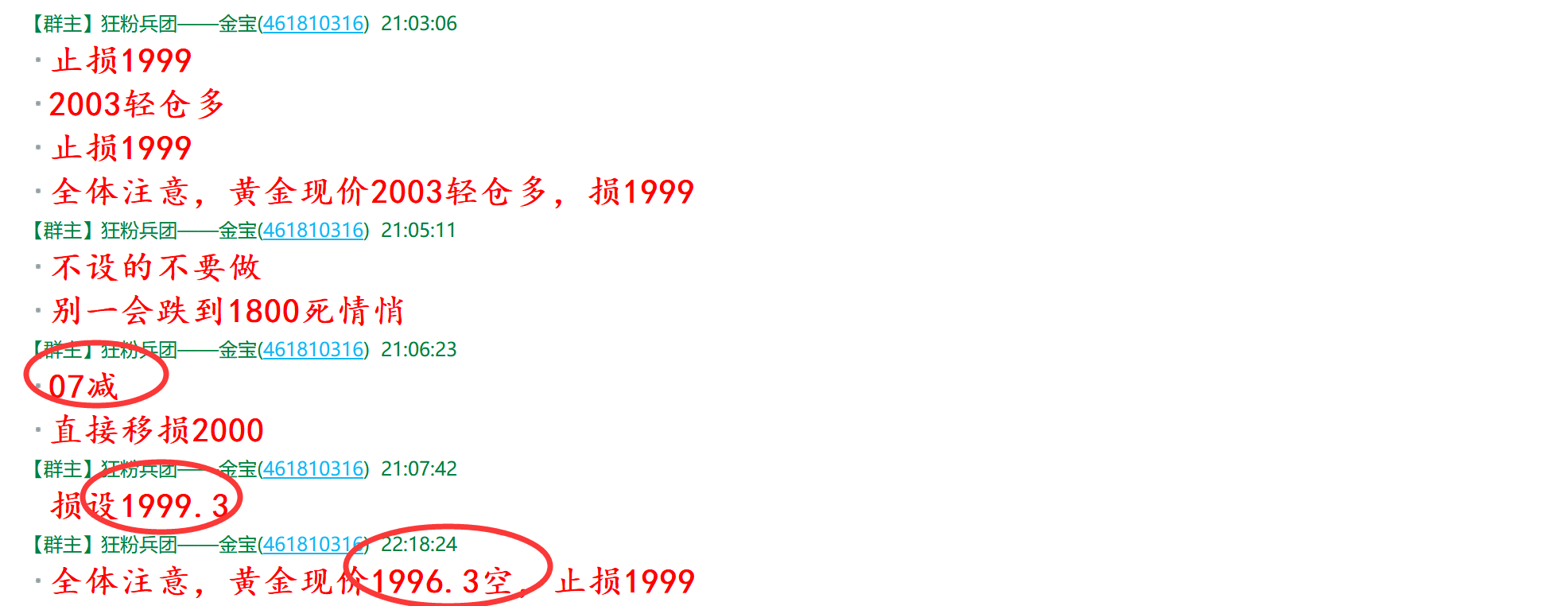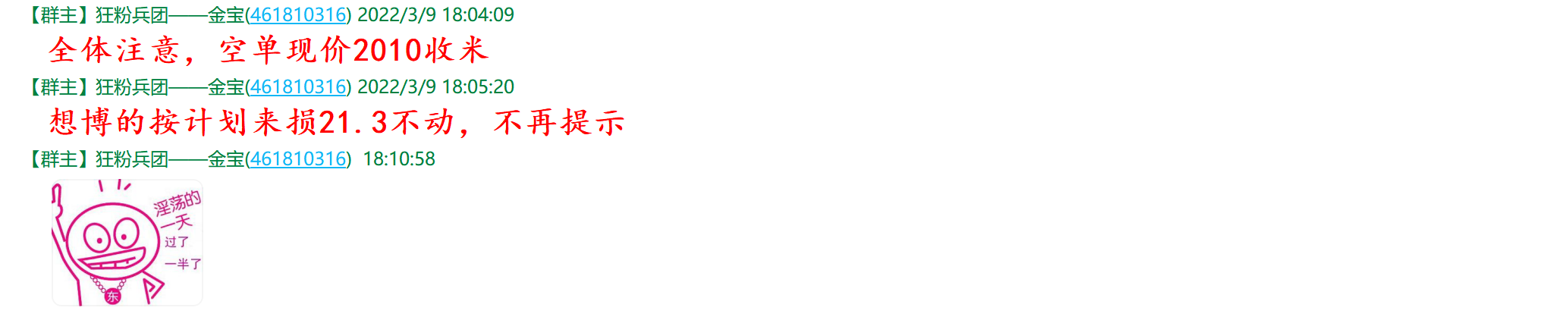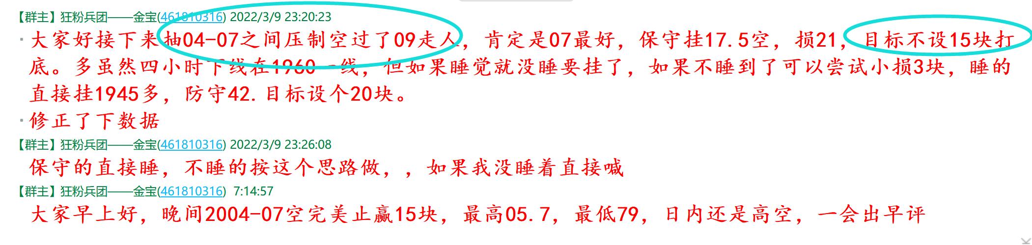行情无对错,没有控制不了的风险,只有失控的人,很多人总想着对,却从不想错了该如何应对,殊不知,这个市场的风险就在于错了之后没有果断的处理方法,成败只在一念之间,一旦陷入抗单的魔咒中,就会无法自拔,而本周我们是多空通吃,昨天欧盘开始战斗,路演全网公开2047开始空,狂粉兵团更是空头一路干到底,尾盘给出的04-07空损09完美下跌25块,按计划打底15块也是梦中止赢,这就是节奏,在砖家2040-40忽又多看2100时,我们已经在做破位空的准备了,晚间直播2003多减仓打损白干后,有朋友问要不要90多,宝哥明确提出看空就只做空,不要想着锅里的看着碗里的,反弹是能赚,但这种影响节奏的事我们不去干,所以才有了04上的空在梦中止赢,所以千万不要干嘴上说着顺势,却做着逆市的操作,而昨天19463路空,坚定空,极端下跌行情,做空是没有任何异议的,宁愿做空损,也不做多损,顺势永远是对的,昨天的行情你是否被教育了?所以,以后的操作上,一定要记得,顺势而为,取财有道。