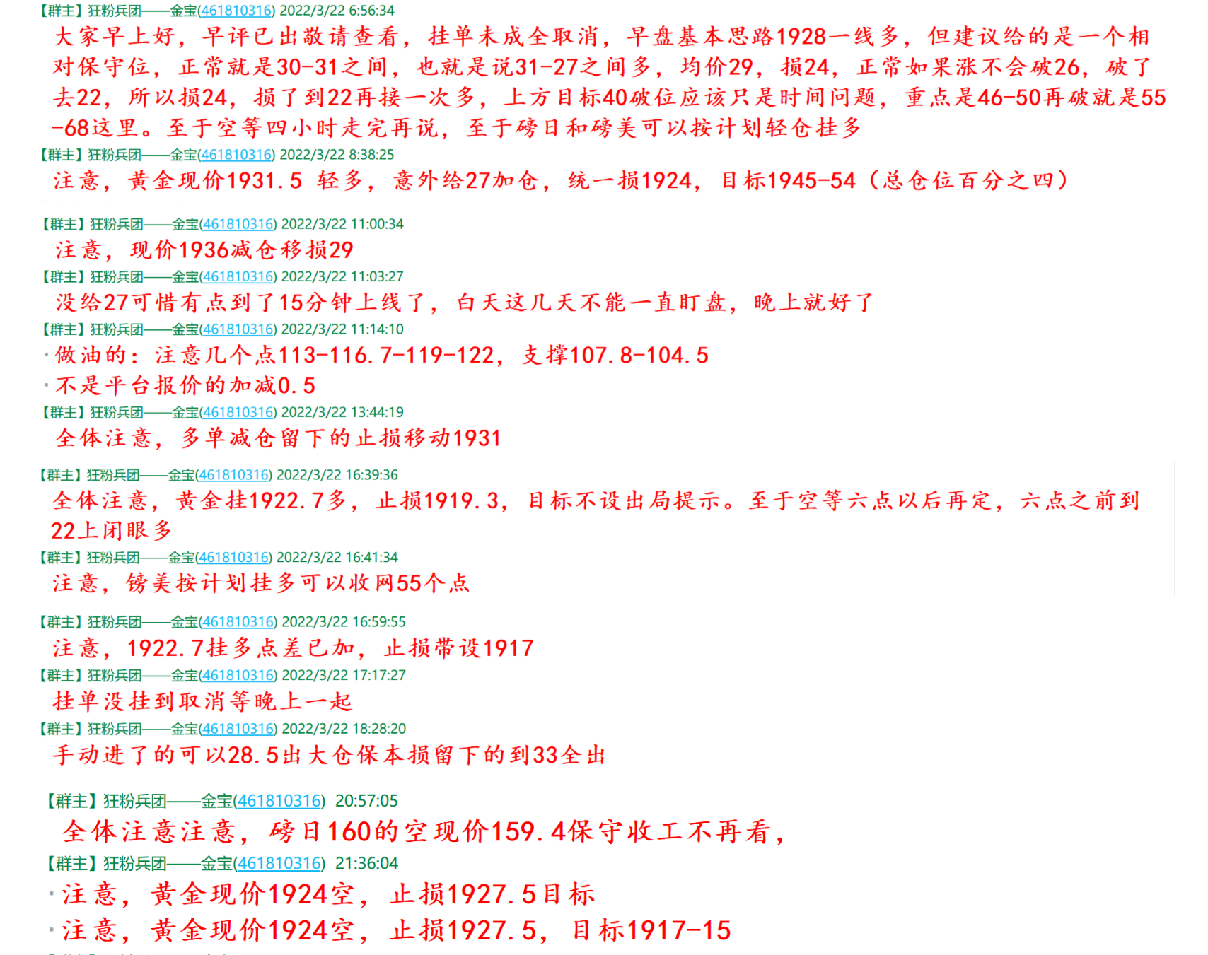 市场只有一个方向,不是多头,也不是空头,而是做对的方向。而时间就是最好的答案,昨天j早盘给出1928上多涨到38符合我们的预期,后边提示挂1922.7的多,差个点差,但是大都数朋友手动进去拉到30.8这里,包括磅美的1.3120挂多,及磅日的的空全是利润,最后破了1922反抽24空也跌到了1910.8,我们在15收网,尾盘给出08上多,1921空,全部走出了预期,结果证明我们的思路也是正确的,所以说任何机会就在眼前,关键的是自己能否把握?就跟昨晚的镑日一样我们平了后边打出新高,所以赚多少取决于市场能给予你多少,合作才能共赢,携手才能走的更远,黄金趋势逐渐明朗,宝哥责任愈加重大,那就是要带领更多的朋友们走向盈利。如果你对交易感到迷茫,对交易失去信心,宝哥希望你能够重塑信心,坚定信念,和宝哥一起在投资的道路上能够越走越远,越变越好!