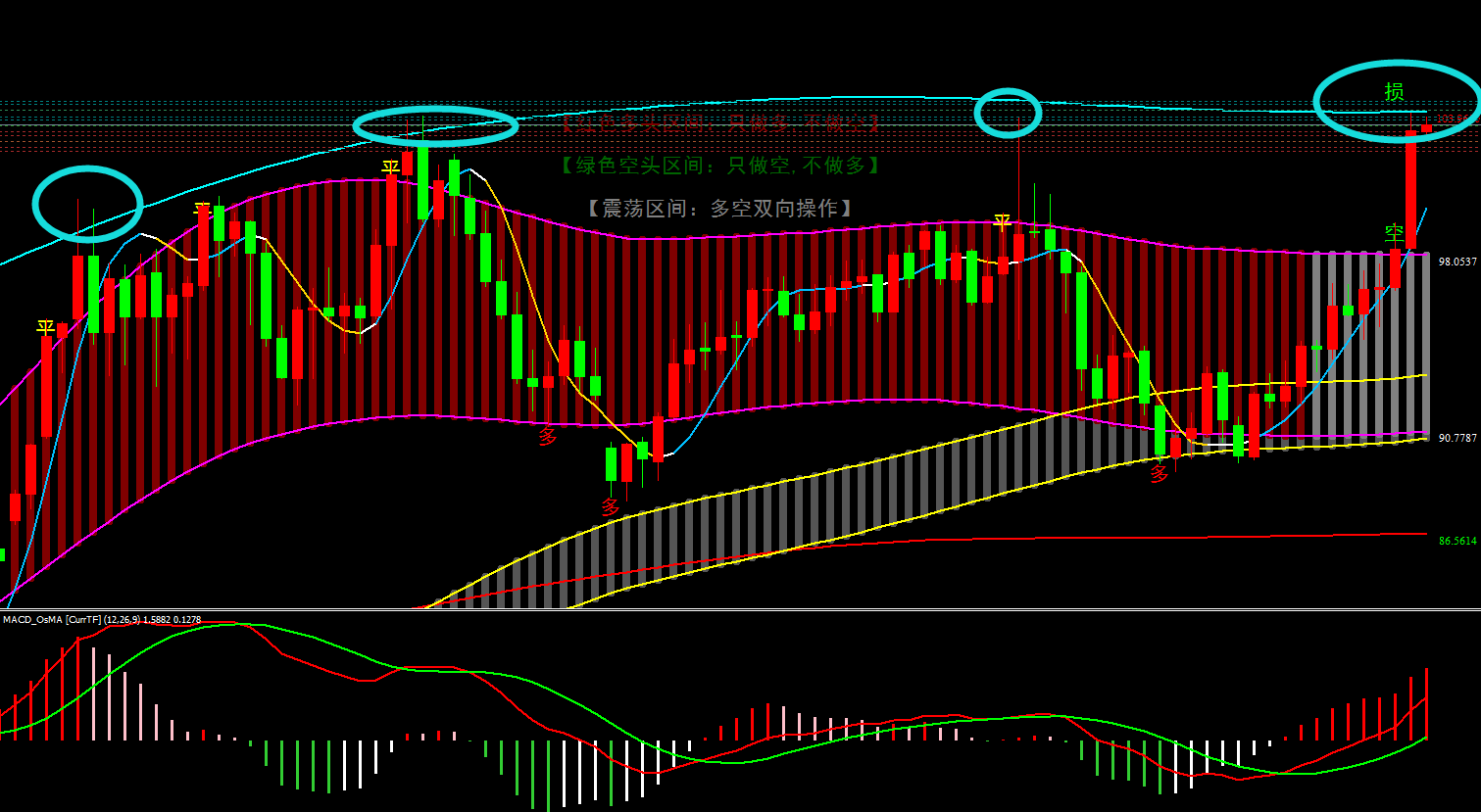 从四小时图来看,昨天价格出现大阳拉升,价格破位价格收回下线以后,系统开始转多,目前已经运行于上线一线,辅助指标MACD金叉向上,量能放大,另外就开篇说的这种行情刚转势,下跌13根,上涨不应该也只有一两根,因此综上所述得出结论如下:低多不变