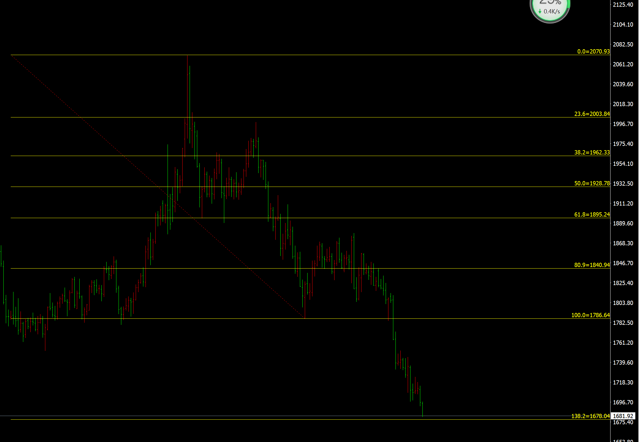 欧盘金价反弹30分钟上线就再次压制,价格破掉83这里,从目前来看,晚间重点关注向下延续的1.382处,这里在1678,如果再破就会去72-65一线打底,而上方短期有压制于均价线这里,而目前价格在81一线,对于趋势线上还是空头,晚间的欧洲利率是否对金价有一定的支撑,这个只能看市场的反应了,而金价本身近期欧美反弹美指下跌中,也没有出现像样的反弹,整体就是一个弱,但是再去追空真需要勇气了,因为虽然刺破四小时加速线,但是没收盘就是未知数,所以个人观点,晚间盯着78这里,不破尝试多,直接破掉等72-65抄底,这里是重点对错都要干65一线,其二就是直接反弹91-93之间还要空一次,防守96.