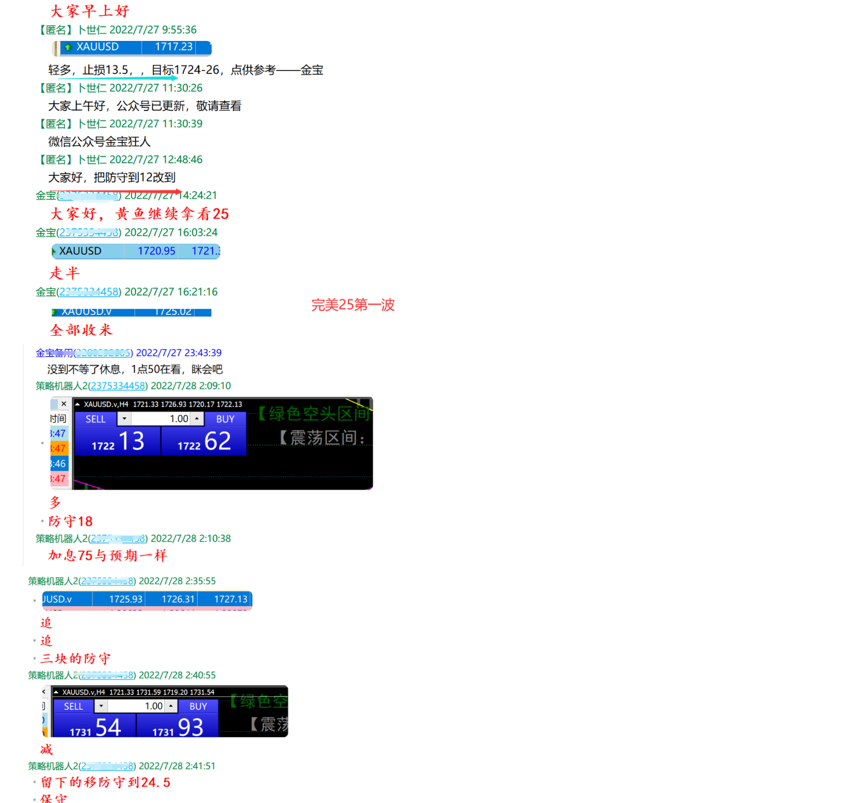 昨天金价如期探底回升,日内先下1713.5,而我们在1717一线多25收割,晚间等07进场没给,后边给出14入场也踏空,利率决议出后市场如期加息75点,第一时间1722多,破了25后在25.9追多完美上行到1740一线,多单在保守在34收网,激进看40.总的取得了不错的战绩,昨天已经成成为历史,辉煌只能代表过去,一味沉浸其中,只会荒废了现在。人生没有彩排,利用好当下的时间潜心努力,才会拥有更好的将来 不管是辉煌还是失败都已经成为历史,今天依然步履匆匆,天地之鉴也,万物之镜也,回归市场,在盈利的道路上我们继续全力拼博向前冲锋,早安朋友!!! 对于今天来看,日图中大阳报收,奠定了黄金1680这一波底部,另外也对前期反复震荡后市上涨有了想像,首先价格昨天我们说了,收在下线上方后市就是下探也回收复,目前来看向市向上线运行的概率加大,给我们一个信号就是逢低买入,四小时靠近下线拉升,目前已经破上线,向加速线去运行,也就是说日内只有这里的压制了,破以后上方暂时就是看上线了,所以对于今天没有什么可说的,只考虑哪里多就行了,昨晚收工时说的回28多正好,顶底转换,空档在23这里,也就是标准的进场就是28-23,而强势就是分批,早盘强势上行,这样防止踏空回横压可以先行介入,因此综合得出结论如下:逢低买入。