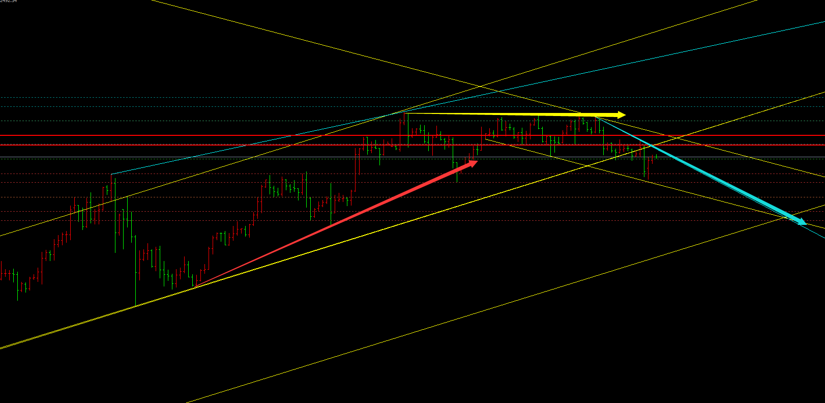 从四小时图表来看,上升通道下破,昨天打到前底形成双底支撑反弹,也是四小时年线,下破后目前就是反弹上边只要不破黄线通道的边线还是会下跌,而第一道侧压力与日图的空档形成共振压力。