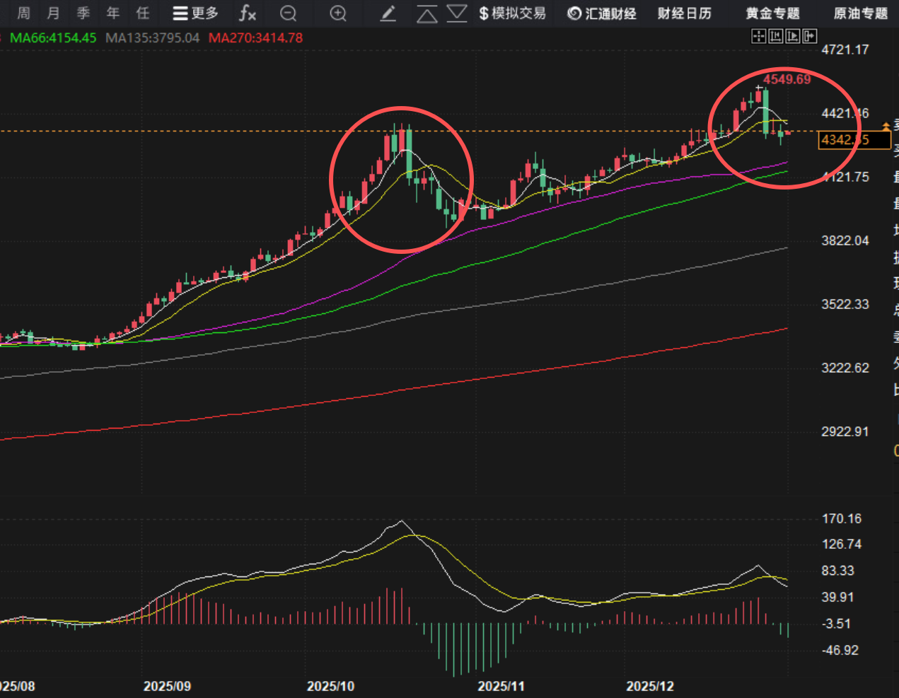 周三黄金延续了周二的下跌,不过价格在下跌一百美元后走出了探底回升,欧盘给38下下跌到晚间反弹55再跌回05附近,收盘以一根带有上下影线的十字阴报收于4319这里,符合预期,从当前盘面来看,日图短期均线至大阴下跌后短期均线死叉向下,整体空头不变,形态上与前一波高点下跌有点相似,不过四小时指标出现严重超卖,短期有望修正,从图上来看关键点还是4375这里,这里不过还会进一步下行,过了去测试四小时的上线4535区域才能再次下行,前得是过的去才,另外白银也是打到四小时下支撑,后续要看市场对芝加所的进一步解读了,历史上二次都是受芝加所的影响二次打回原形,1980年的53高点到5块多,二次是2011年的49.86到11.6,周三加保证金所以白银修正后再次跌回70,从技术面来看70是四小时的下线,这里应该也是短期的一个平台位,一旦破了后市有望测试63-58一线,所以理性对待,特别做实物的不要盲目跟风,回到黄金早盘跳空高开力度上比白银更强一些,周五是刺破30分钟上线下行,早盘这里已经上破,上边将进一步去30分钟加速线82和小时图上线60,其次就是四小时的短期均线95这里又是日图的十日均线,下方支撑日图支撑4296,周三美盘二次低点支撑05这里,所以综合得出结论:今天按宽幅震荡对待,操作上卡点强压力左侧入,弱压力右侧配合信号入。