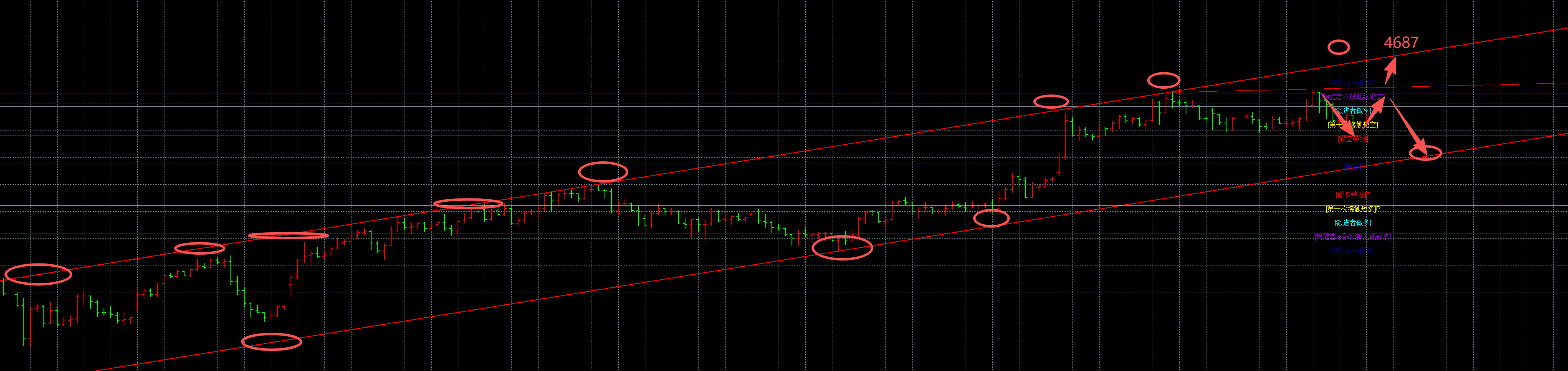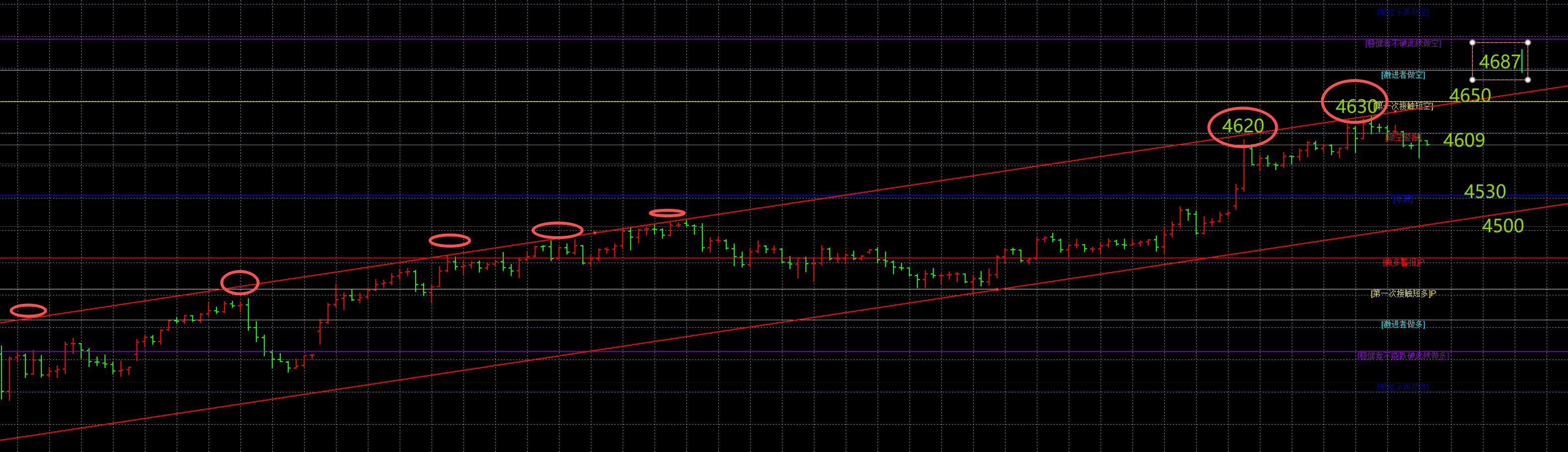 压力:4600-4609-25-48-87,支撑4578-62-50-43-35-4506-4463 (给的比较多,如果出现大极端行情可以翻阅查看)