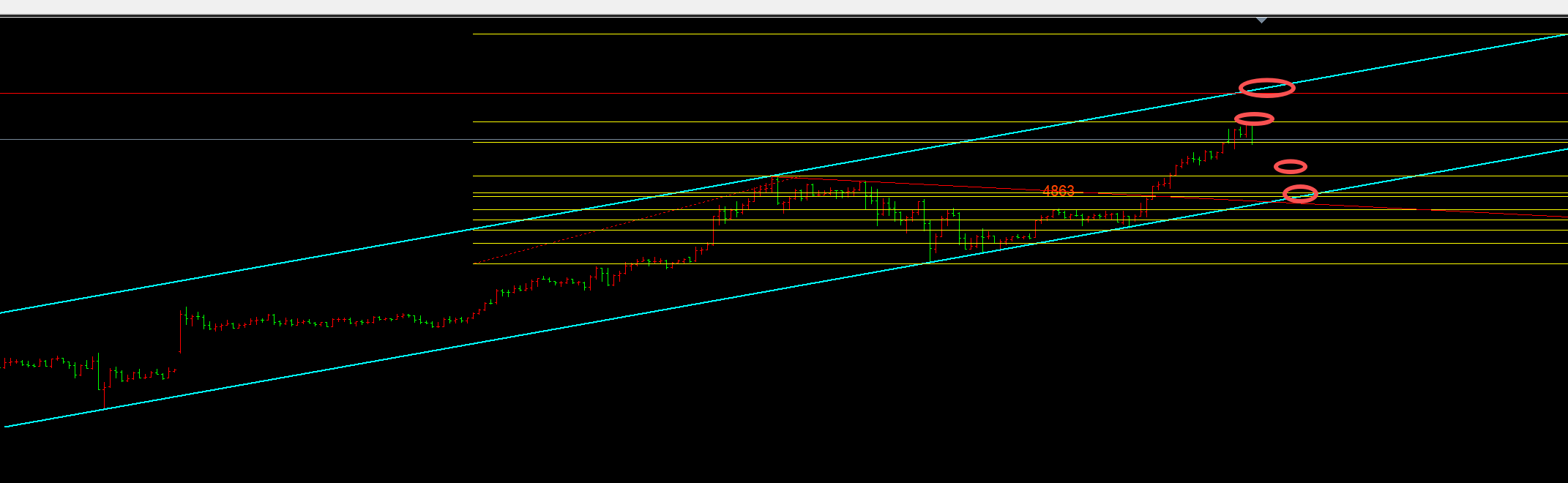 多点:4885-80一档,其次是4855-50为一档。空点1.618这里4967-71已经下走了一档,4987-5000为一档,其次是5015-23这里为一档,到位配合一分钟弱空进场就行,再过5025就是5050周五了机会肯定会更多,不会比周三的机会少。