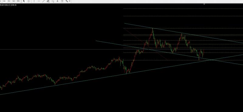 周五黄金如预期价格在3252压制,价格在3243转空后一路下行,盘中也如早评所讲的回到了3154这里,尾盘在企稳3180后走出了20多美元的反弹,日图以一根带有下影线的较长的小阴线报收于3201,而早盘受基本面影响出现跳空高开,从图表来看,价格回落中期上升趋势线支撑3120附近,周五二次也算是确认,短期价格将重新回到3500