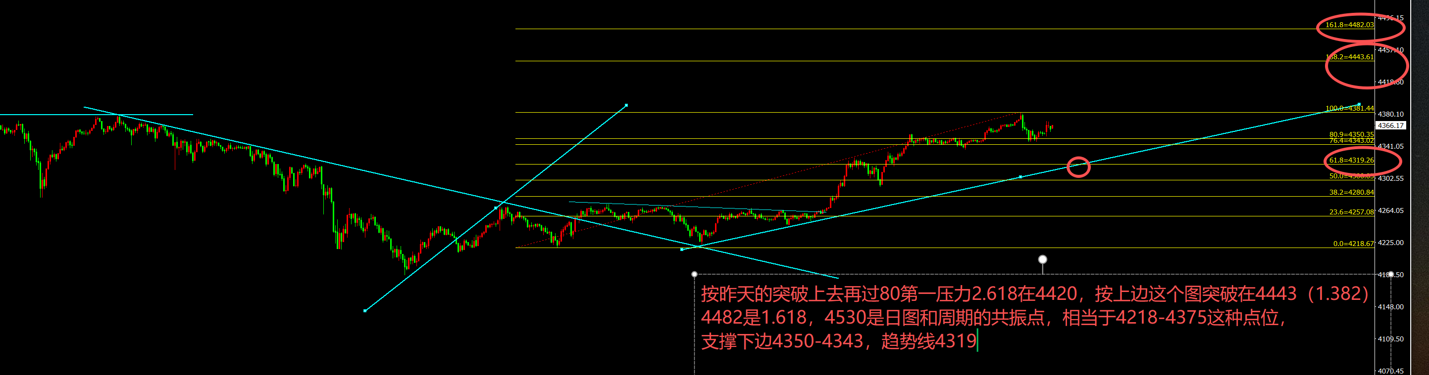 周五黄金在延续周四的大涨后,价格拉升到4379形成下跌,盘中跌破40进一步下行,晚间反弹后再次下破,最低到4186一线,虽然尾盘有反弹,但是整体收一根大阴线,而我们早盘4372空,欧盘在形成震荡给给出4348-30的反复空,晚间反弹4367空,下破4280追空全部取得了不错的战绩,对于今天来看有几方面看法供参考: 日