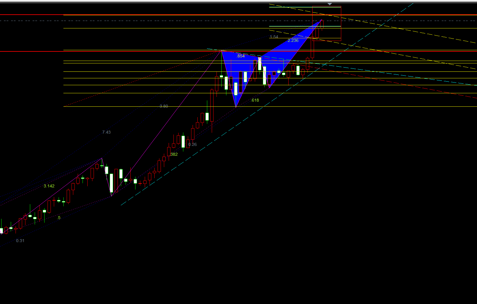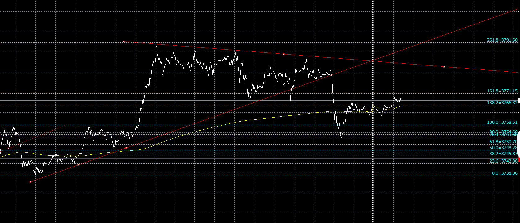 昨天黄金再创新高,从连续两天的运行时间和结构从上图可以看出来,早盘修正,午后一点左右突破回落可始拉升,周一周二全部如此,这也是为什么昨天在午后48上多的原因,至于空从图表上可以看出,突破向上延伸的2.618位正好是3791这里,所以我们在3780-90分批空,至晚间价格下跌反弹又是走了一个双头动作,一是30分钟加速