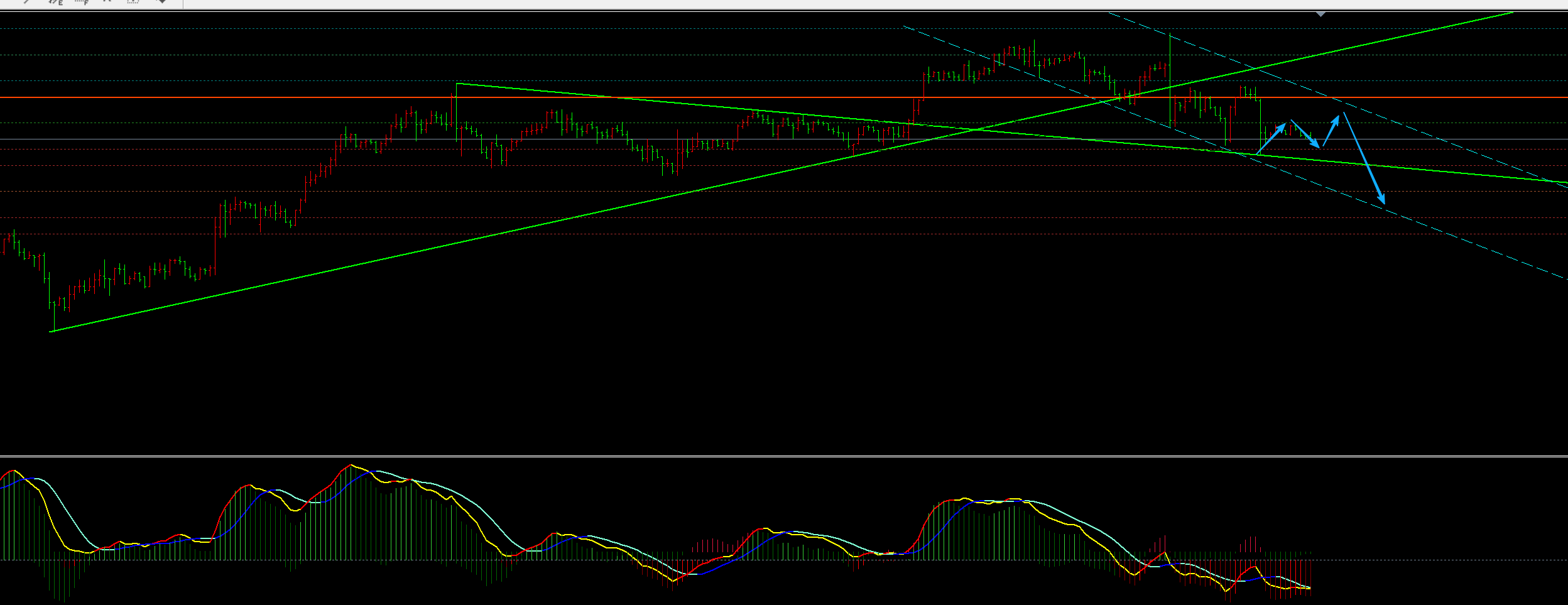 昨天黄金继续走宽幅震荡,亚盘跌欧盘反弹美盘跌,从整个运行来看,欧盘再次触及早盘高点小破再跌,最终以带有上下影线的阴收报线,从趋势的角度来看空头没变,从运行的方式来看还是一个宽幅震荡,现在日图弱空,但是价格还在上线支撑,昨天早评也说了只有进一步收复上线才能进一步打开下跌格局,其次价格目前也运行到四