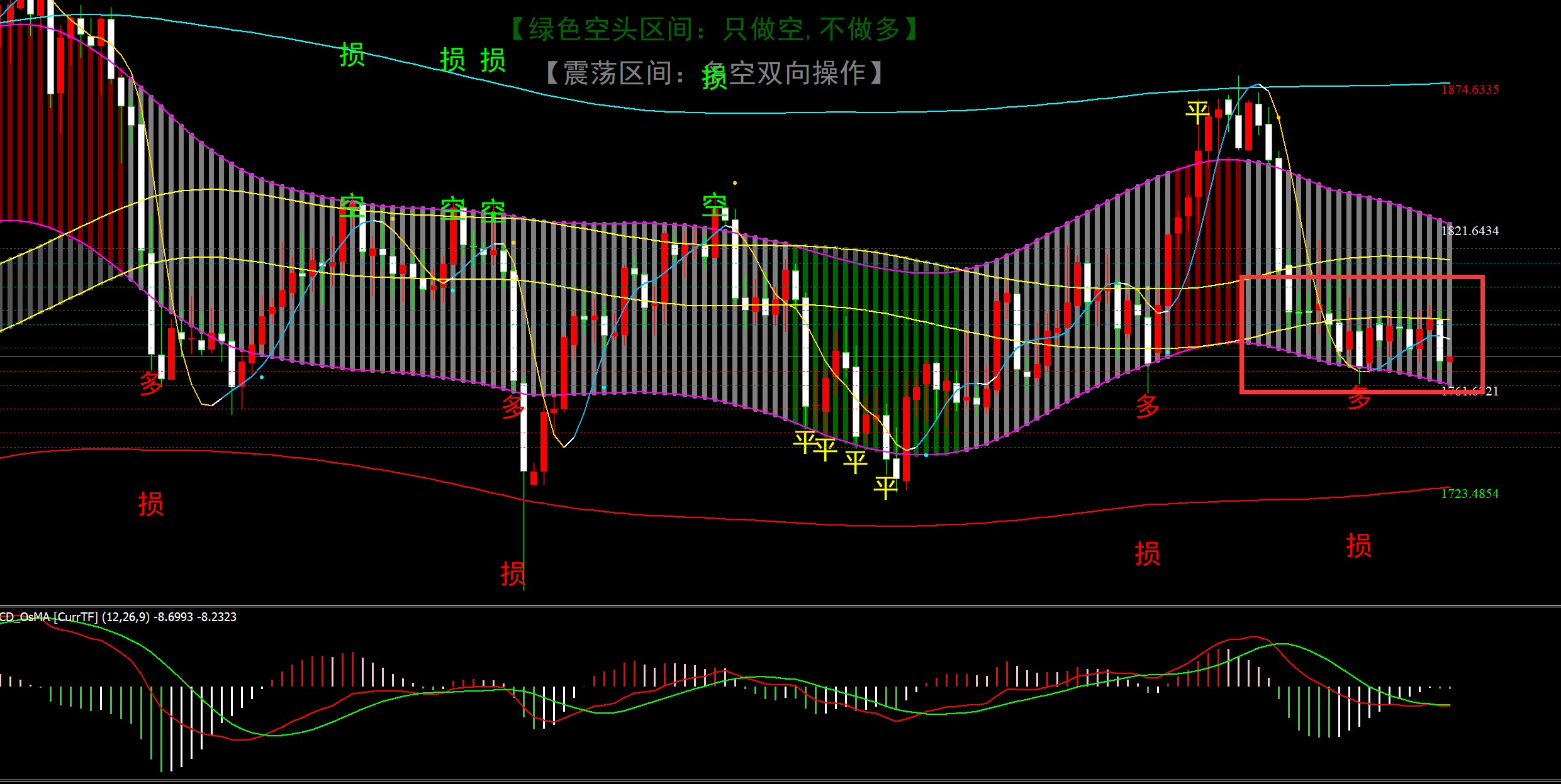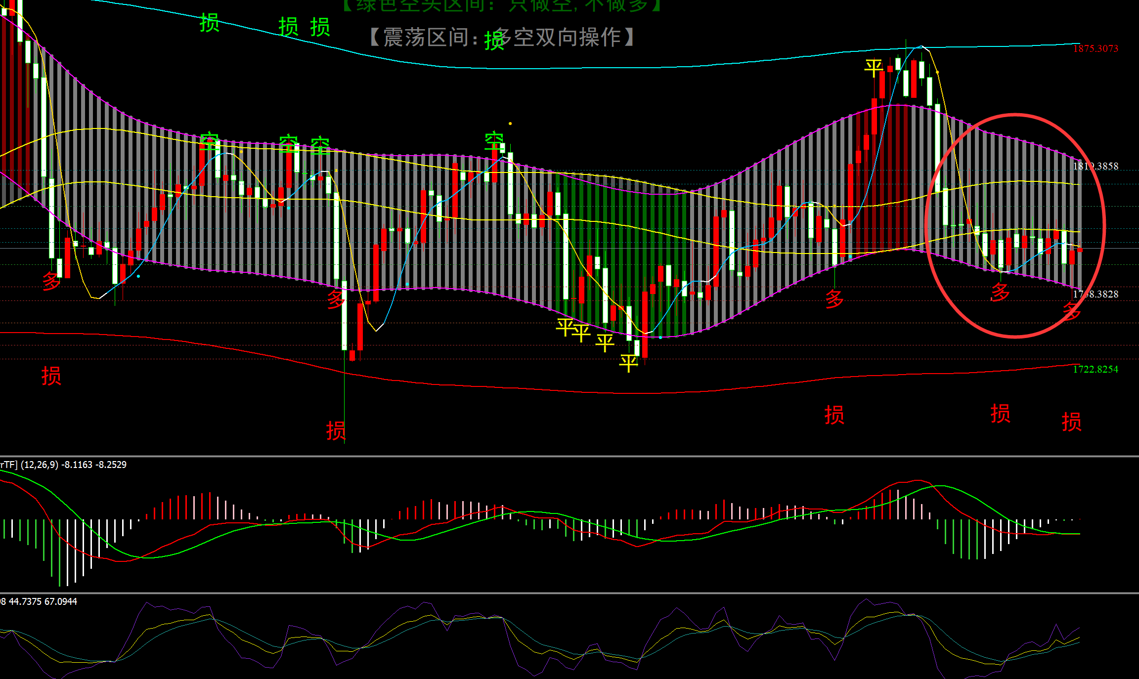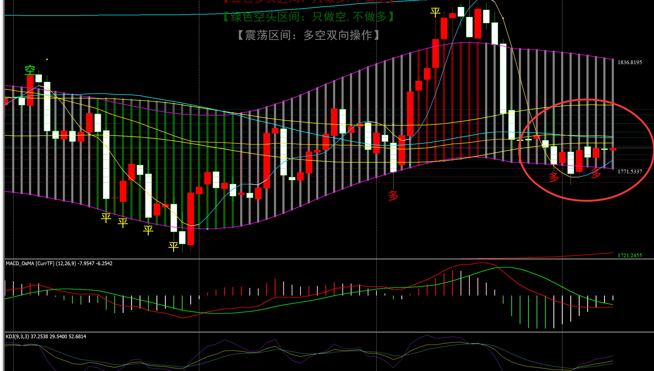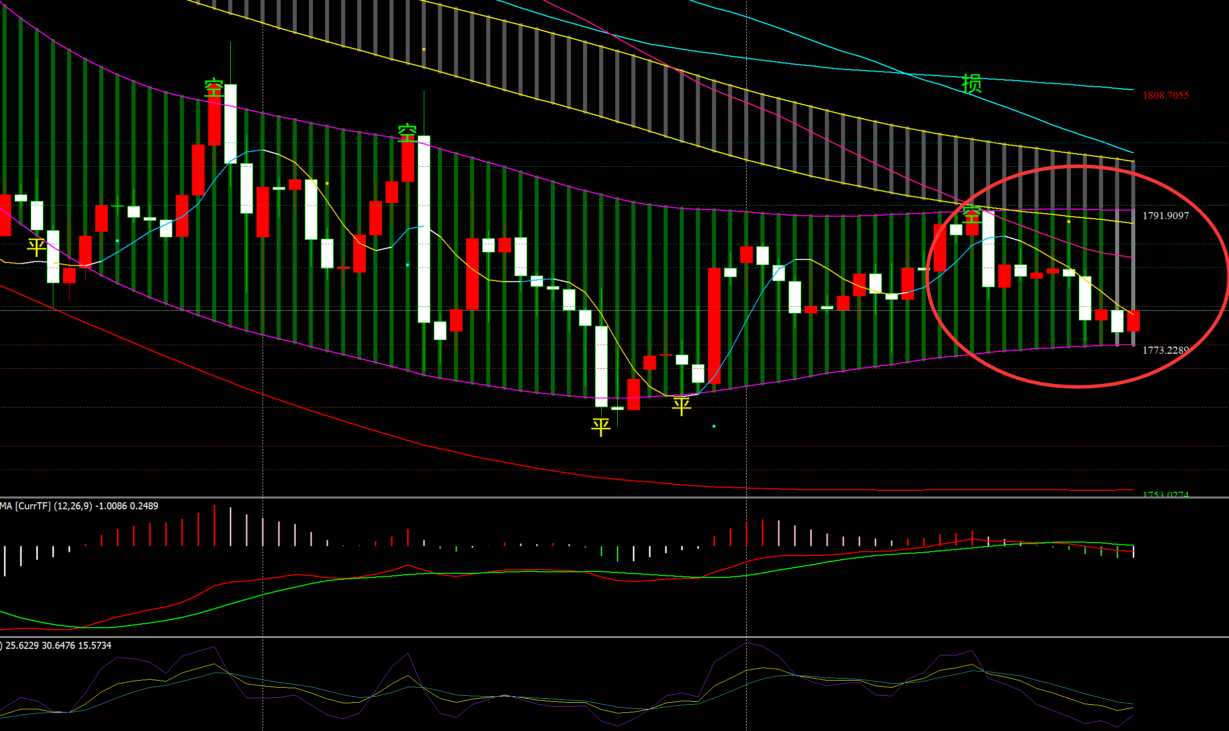 昨天金价冲高回落,盘中最高1793,最低1779.5,收盘以一根上影线较长的十字阴线报收于1782.7。 从盘面来看,价格连续七天走出了阴阳转换,上破不延续,下跌也不延续,明显的窄幅震荡,哪也就说明了一点在日图真正破位之前,不能以太大的奢求来看大涨或大跌,真正破位以日图收盘及选离破位点,而当下高抛低吸为主,