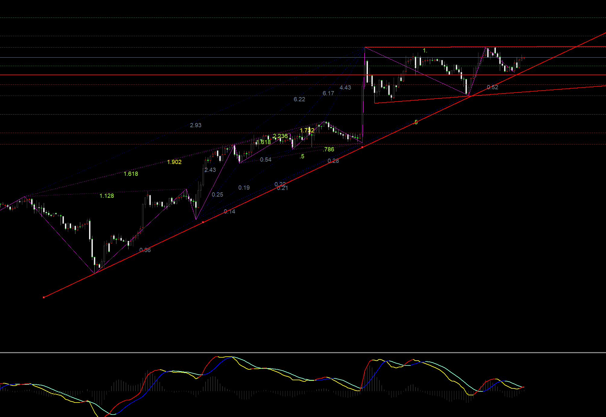 日内金价至早盘60分钟转空下跌,到欧盘30分钟出现企稳修正,总的来看日内还是走一个震荡格局,趋势上所早盘所讲上升格局不变,价格在严重背离每次下跌均在小时图的下线出现拉升,从七点的收盘来看,四小时形态上升三角整理,但是离上线太近了,虽然还是多但不宜去高位追,欧盘30受压形成小时回补位上升,但60的上线没破