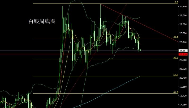 上周白银市场周初开盘在25.437的位置后行情先拉升给出26.012的位置后行情受到节本面和技术压力快速回落,周线最低给到了24.177的位置后行情整理,周线最终收线在了24.305的位置后行情以一根上影线很长的大阴线收线而这样的形态收尾后,本周的行情延续空,点位上,早盘24.4就可以空止损24.6下方目标看24整数关口和23.7支撑点。