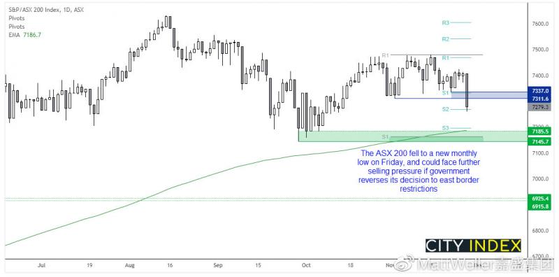ASX200指数现在面临的最大风险是,澳大利亚政府周三是否收回放宽旅行限制的决定,或者各州是否依据实际情况保持入境限制;而最大的上升潜力则是,旅行限制放宽且新的变异病毒确实温和、不具有重大威胁。ASX200指数上周五收于7300下方,创下11月最低点。支撑位在周图第二中枢支撑,价格有可能下探7200。请注意7145-7185的密集支撑区域,阻力则在7310-7337一线。