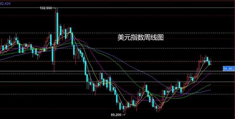 美元指数市场上周大区间波动,周初行情开盘在95.651的位置后行情小幅回踩95.6的位置后行情强势拉升,日线最高触及到了96.484的位置后行情尾盘受到非农影响强势回落,周线最终收线在了95.732的位置后行情以一根上影线极长的射击之星形态收线,而这样的形态收尾后,周线在技术上有一定的回落压力,但基本面美联储加快加息步伐的背景下,下周的行情短空后多。