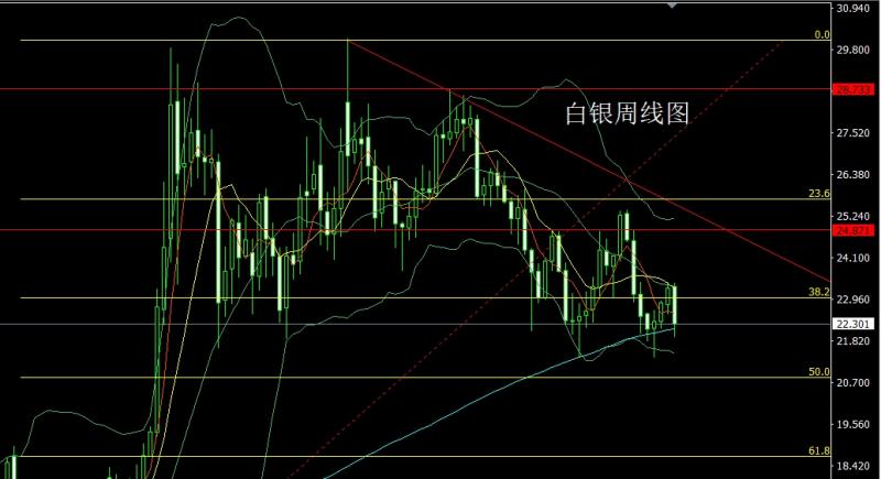上周白银市场周初开盘在23.307的位置后行情小幅拉升给出23.307的位置后行情小幅拉升给出23.405的位置后行情快速回落,周线最低给到了21.893的位置后行情整理,周线最终收线在了22.301的位置后行情以一根下影线很长的大阴线收线,而这样的形态收尾后,本周如果先回落22.1多止损21.95,目标看22.45和22.6离场反手直接空,止损22.85,下方目标不放,不损阶段性持有。
