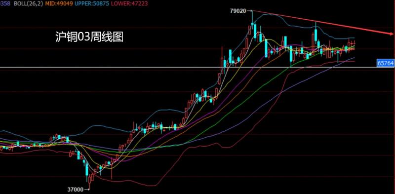 沪铜03市场上周区间波动,周初开盘在71245的位置后行情先回落,最低给到了69679的位置后行情强势拉升,周线最高触及到了72019的位置后行情整理,周线最终收线在了71327的位置后行情以一根下影线长于上影线的十字星形态收线,而这样的形态收尾后,本周71750空止损72100下方目标看71000和70500-70000.
