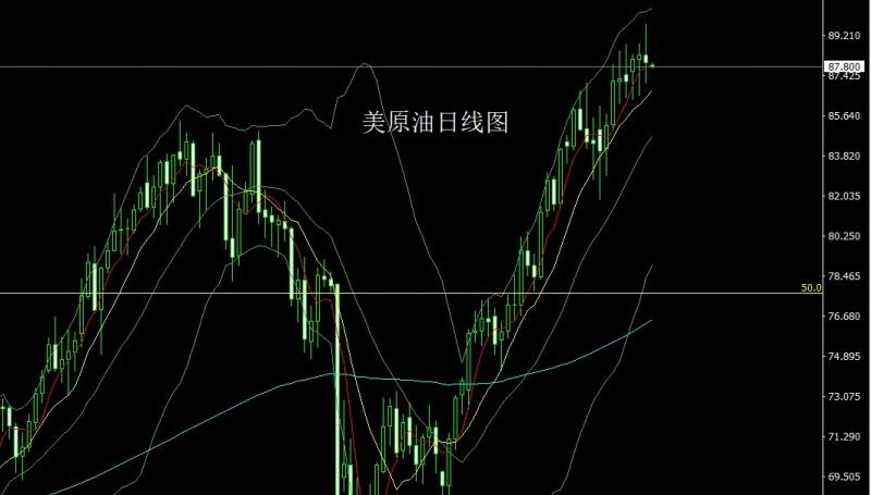 昨日美原油市场早盘开盘在88.306的位置后行情先拉升给出89.727的位置后行情冲高回落,日线最低给到了87.071的位置后行情整理,日线最终收线在了87.983的位置后行情以一根上影线长于下影线的长脚十字星形态收线而这样的形态收尾后,今日的行情如果先回落给出86.6多止损86.1,目标看87.2和87.7-88