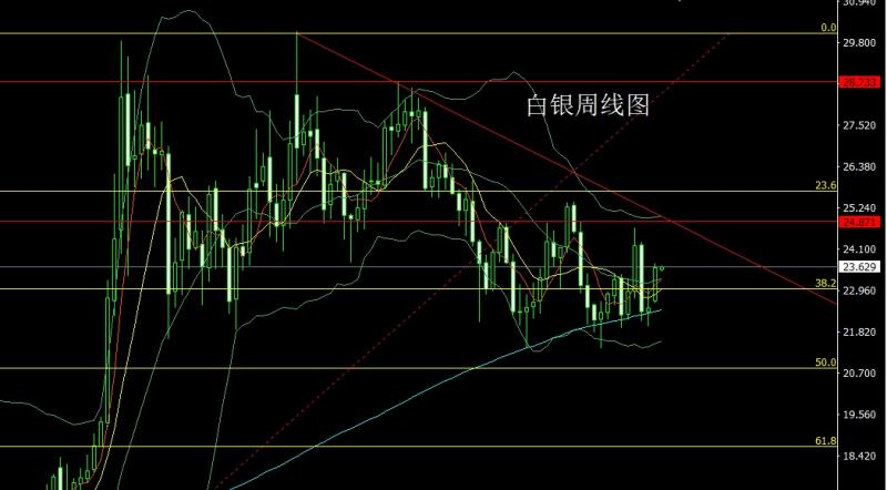 上周白银市场周初高开在22.677的位置后行情小幅回踩22.641的位置后行情强势拉升,周线最高触及到了23.711的位置后行情冲高回落,周线最终收线在了23.599的位置后行情以一根上下影线基本等长的大阳线收线,而这样的形态收尾后,本周23.4多,止损23.1,目标看23.75.破位看24和24.35。