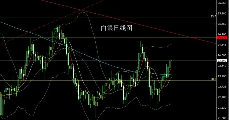 昨日白银市场早盘开盘在23.549的位置后行情回落给出23..5的位置后行情拉升,日线最高触及到了23.939的位置后行情整理,日线最终收线在了23.848的位置后行情以一根上影线较长的大阳线收线,而这样的形态收尾后今日的行情23.7多止损23.55,目标看23.95和24.1-24.2这个区间。