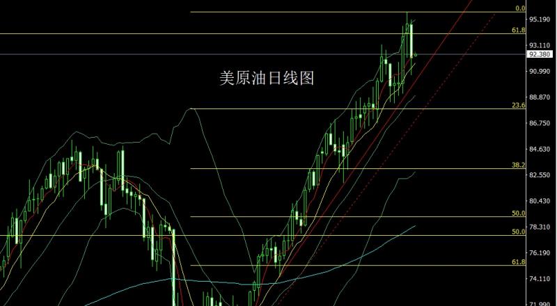 昨日美原油市场早盘开盘在94.742的位置后行情小幅拉升给出95.152的位置后行情伴随避险消退的因素出现获利了结行情,日线最低给到了90.562的位置后行情超跌反弹,日线最终收线在了92.017的位置后,日线以一根下影线很长的大阴线收线,而这样的形态收尾后,今日的行情回踩空,点位上,今日的行情93空止损93.6下方目标看91.5和90.5,跌破看90.2和89.5附近支撑。