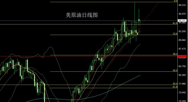 昨日美原油市场高开在95.467的位置后行情先拉升给出高点98.284的位置后行情冲高回落,日线最低给到了93.689的位置后行情整理,日线最终收线在了95.026的位置后行情以一根上影线极长的射击之星形态收线,而这样的形态收尾后,今日的行情97.4空止损98.1,下方目标看96和95,跌破看93.7,跌破的话行情有回补缺口过程,目标看93.2和92.