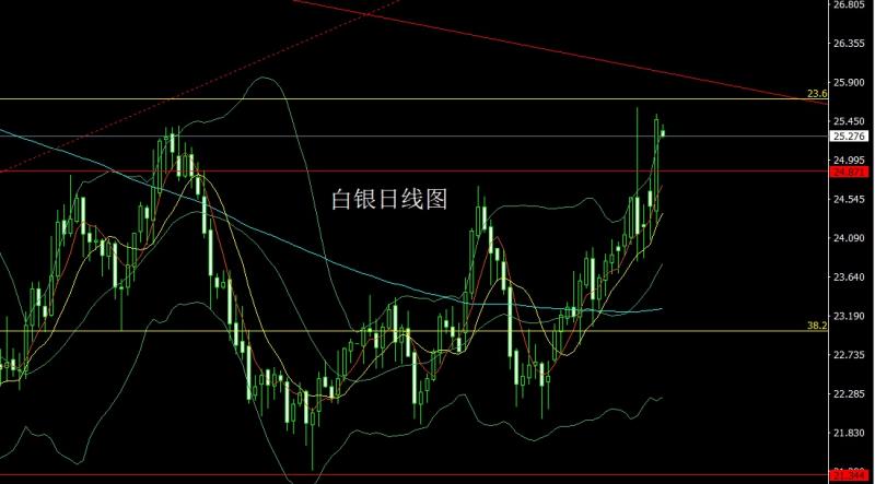 昨日白银市场早盘低开在24.401的位置后行情回踩24.263的位置后行情受到避险需求拉升,日线冲破前日高点后行情最高触及到了25.536的位置后行情整理,日线最终收线在了25.462的位置后行情以一根下影线很长的大阳线收线,而这样的形态收尾后,今日的行情避险延续下又继续看多需求,点位上,今日25多止损24.7,目标看25.55和25.8-26.