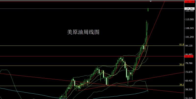 上周美原油市场伴随俄乌冲突加剧的避险因素影响原油强势拉升,周初高开在95.483的位置后行情回落给出93.585的位置后行情强势拉升,周线破位前一周射击之星高点后行情强势反转拉升,周线最高触及到了114.626的位置后行情整理,周线最终收线在了113.096的位置后行情以一根下影线稍长于上影线的大阳线收线,而这样的形态收尾后,市场已经疯狂,今日的行情高开后,行情会有回补过程,点位上,现价124.2轻仓短空,止损125,下方目标看121和118附近离场,下方116附近多,止损115,目标看125和127和130压力。