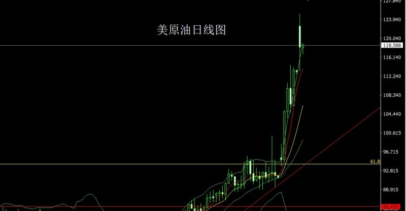 昨日美原油市场受到避险刺激高开在122.533的位置后行情先拉升给出125.019的位置后行情出现获利了结过程,日线最低给到了113.218的位置后行情回补缺口强势反弹,日线最终收线在了118.161的位置后,日线以一根下影线长于上影线的大阴线收线,而这样的形态收尾后,今日的行情区间操作点位上,今日115多止损114.4,目标看118和120以及122附近,上方123附近考虑区间空。