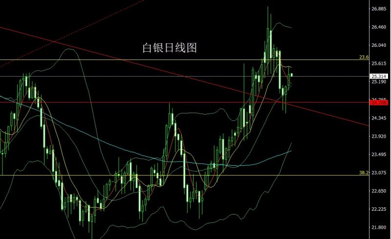 白银市场昨日开盘在25.103的位置后行情回踩24.978的位置后行情震荡上行,日线最高触及到了25.535的位置后行情承压整理,日线最终收线在了25.357的位置后行情以一根上影线稍长于下影线的大阳线收线,而这样的形态收尾后,今日的行情回踩先多,点位上,今日25.15多止损24.95,目标看25.55,破位看25.7和25.85压力离场准备空。