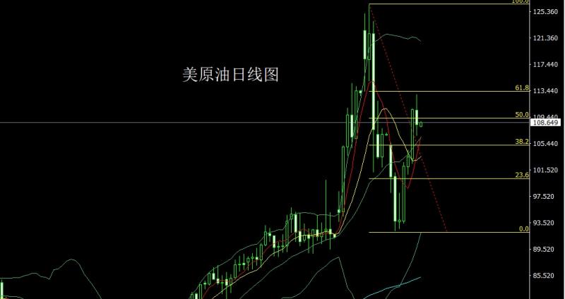 昨日美原油市场冲高遇阻回落,早盘行情开盘在110.521的位置后行情先拉升,触及本轮调整斐波那契的最后压力关口112.92的位置后行情遇阻强势回落,日线最低给到了106.6的位置后行情整理,日线最终收线在了108.277的位置后行情以一根上影线稍长于下影线的大阴线收线,而这样的形态收尾后,日线调增信号出现,今日的行情延续空,点位上,昨日110.5的空减仓后止损跟进在111持有,今日的行情109.5-109.8这个区间空,止损110.5下方目标看107-106.6,跌破的话看105.2和104.5.