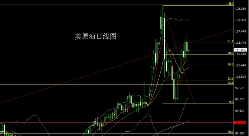 昨日美原油市场冲高回落,早盘开盘在113.655的位置后行情先拉升给出115.928的位置后行情承压回落,日线最低给到了109.817的位置后行情整理,日线最终收线在了110.437的位置后行情以一根上影线长于下影线的大阴线收线,而这样的形态收尾后,今日的行情回踩空,点位上,今日的行情112.2-112.5空止损113.2下方目标看109.8,跌破看108.8和107.8支撑点。