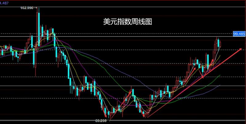 上周美元指数市场早盘开盘在98.218的位置后行情回踩98.152的位置后行情震荡拉升,周线最高触及到了98.993的位置后行情回落,周线最终收线在了98.804的位置后行情以一根上影线稍长的中阳线收线,而这样的形态收尾后,周线双阳夹阴,本周的行情回踩低多有冲高需求。